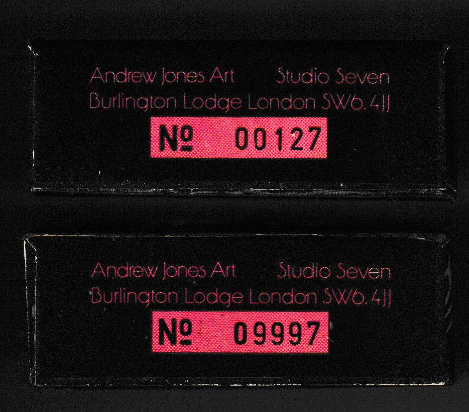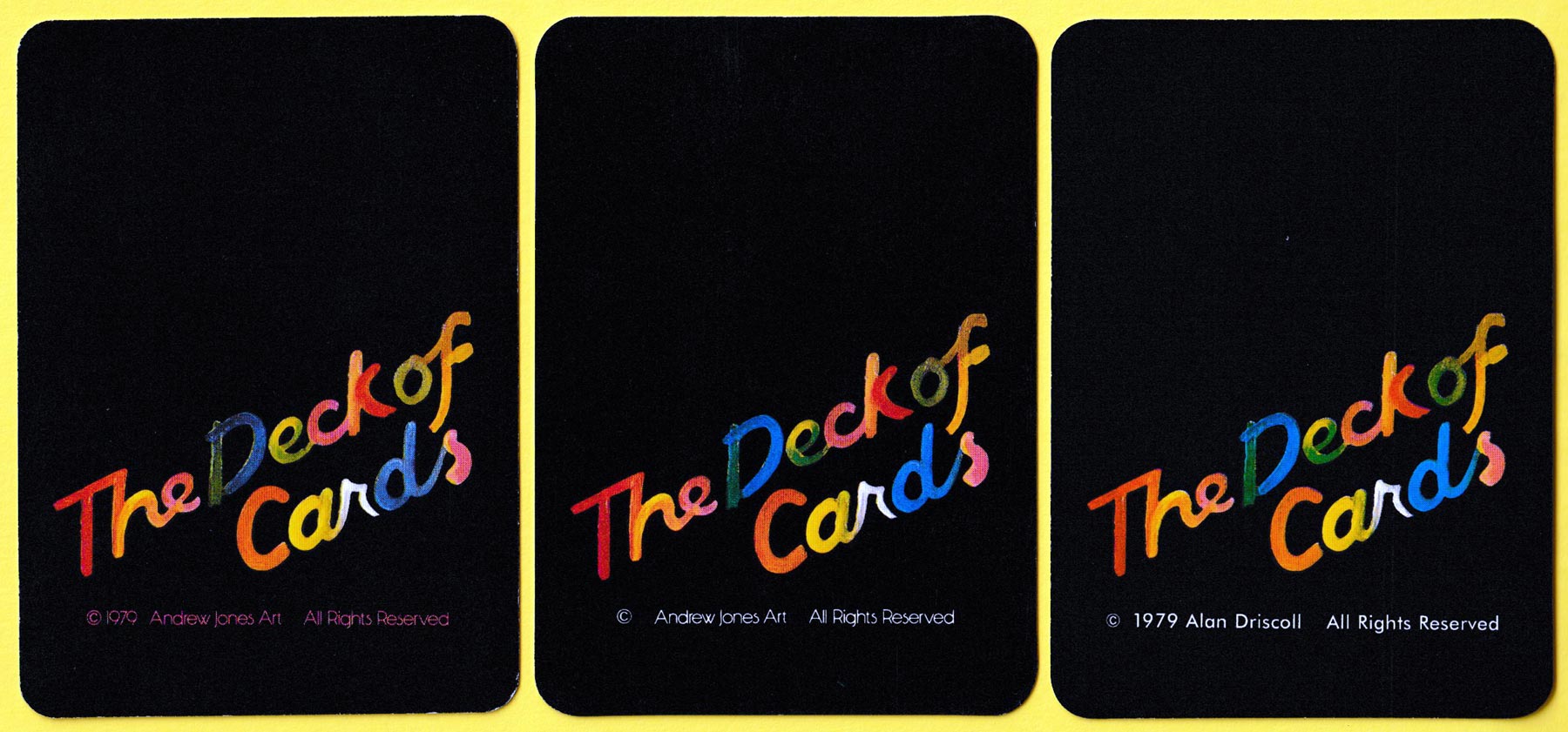 The first edition consisted of a numbered edition of 10,000 packs – a not inconsiderable print run for a non-standard, ‘unplayable’ set – in a hard box. The bottom line of text on the title card is in red. This was followed by an unnumbered edition in a hard box marked “HWGA”, standing for “Here we go again” (print run was probably 5,000). For the next edition, the hard box was marked “Britain” on the bottom edge. By now, the text on the title card had been changed to white. After this, the hard box was abandoned, replaced by a tuck box but still published by Andrew Jones Art, with a title card where the date “1979” has been removed. Then, in about 1990 or 1991, Andrew Jones sold the distribution rights to Alan Driscoll who continued to market the pack with his own name on the box and on the title card (with the date “1979” included again).