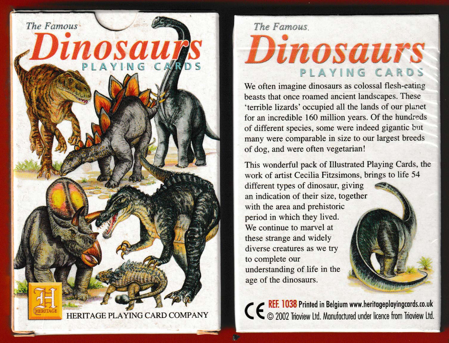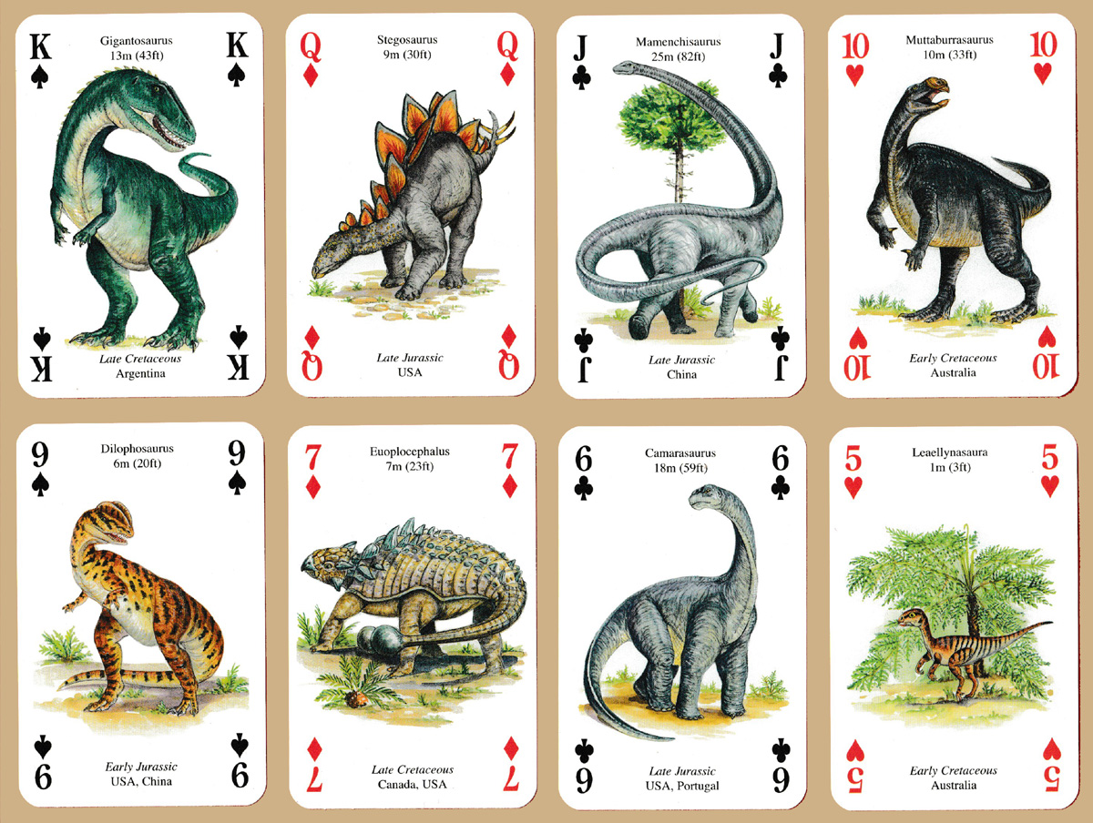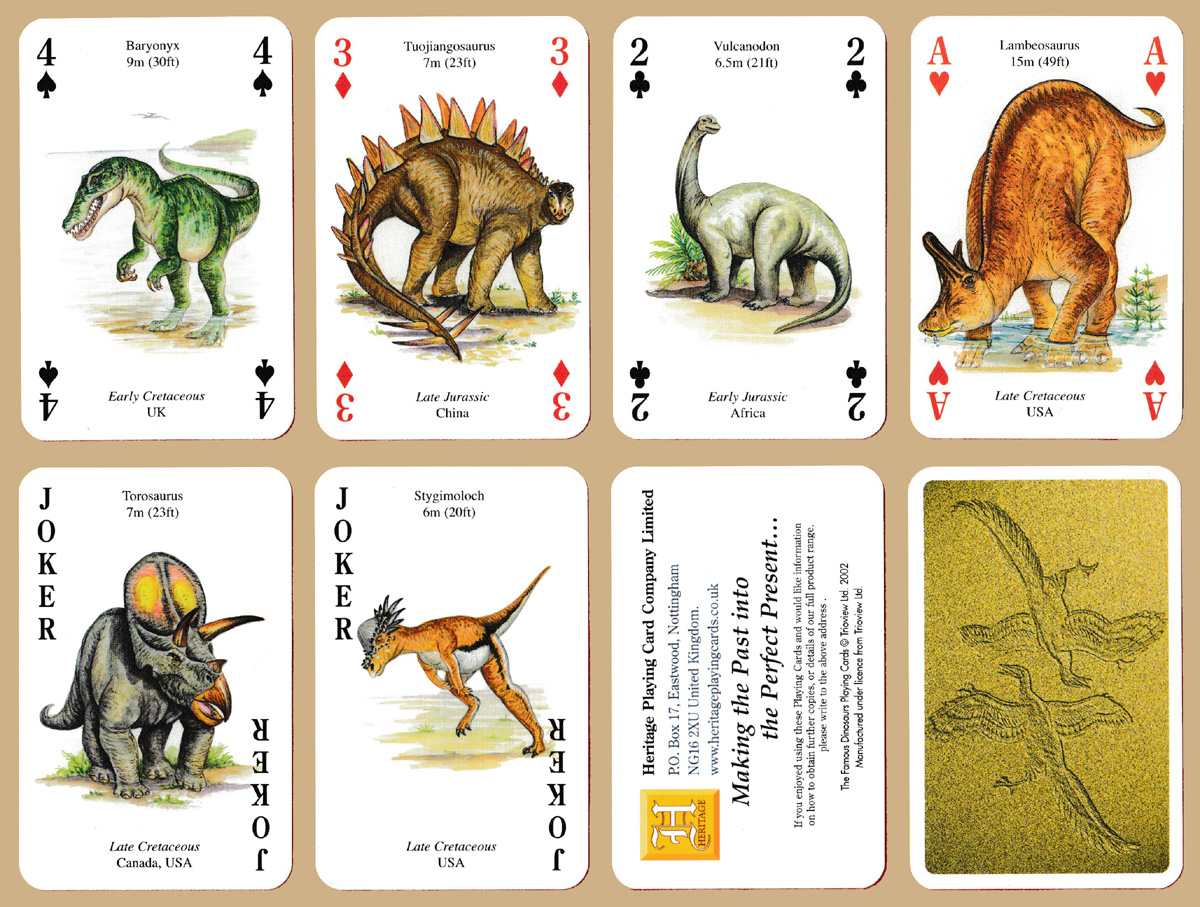 Above: The Famous Dinosaurs Playing Cards printed by Carta Mundi, Turnhout, Belgium, for the Heritage Playing Card Company, Nottingham, UK, 2002. 52 cards + 2 Jokers + 1 publicity card + publicity booklet in tuck box. © 2002 Trioview Ltd.