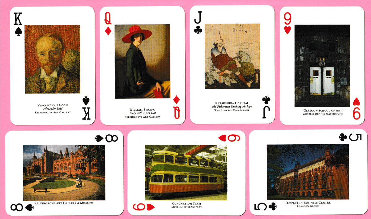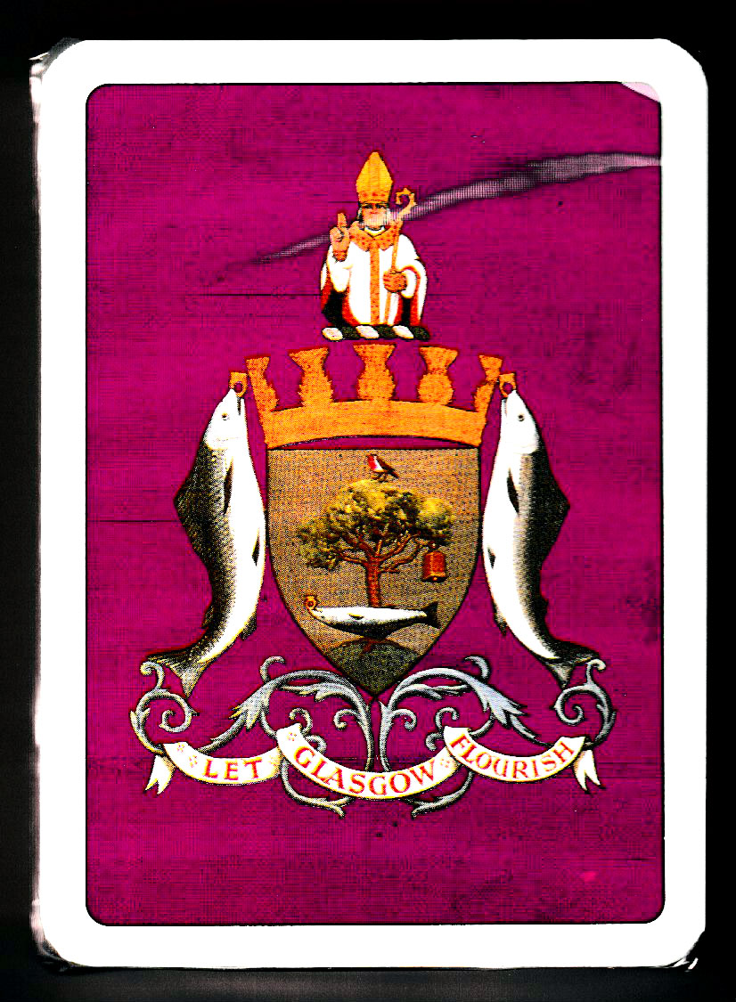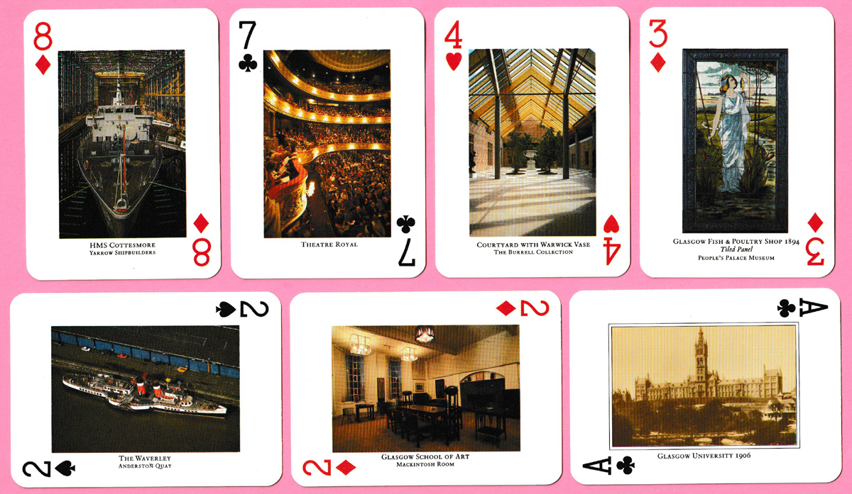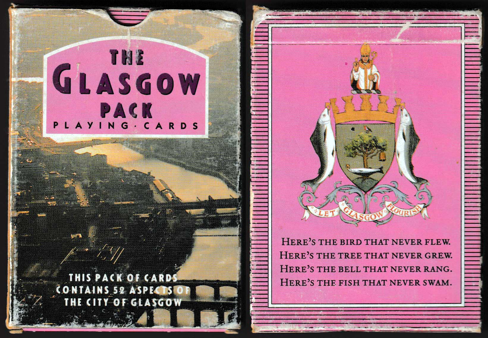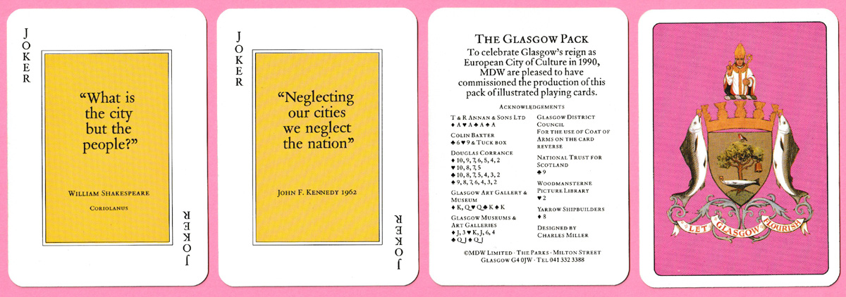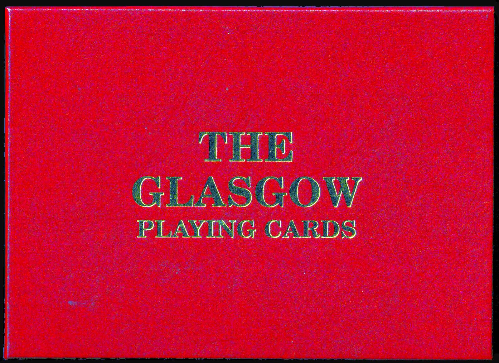 Above: The Glasgow Pack commissioned by MDW Limited, Glasgow, Scotland, 1990. Printed by Carta Mundi, Turnhout, Belgium. 52 cards + 2 Jokers + 1 extra card in tuck box. Size: 63 x 88 mm. © MDW Limited