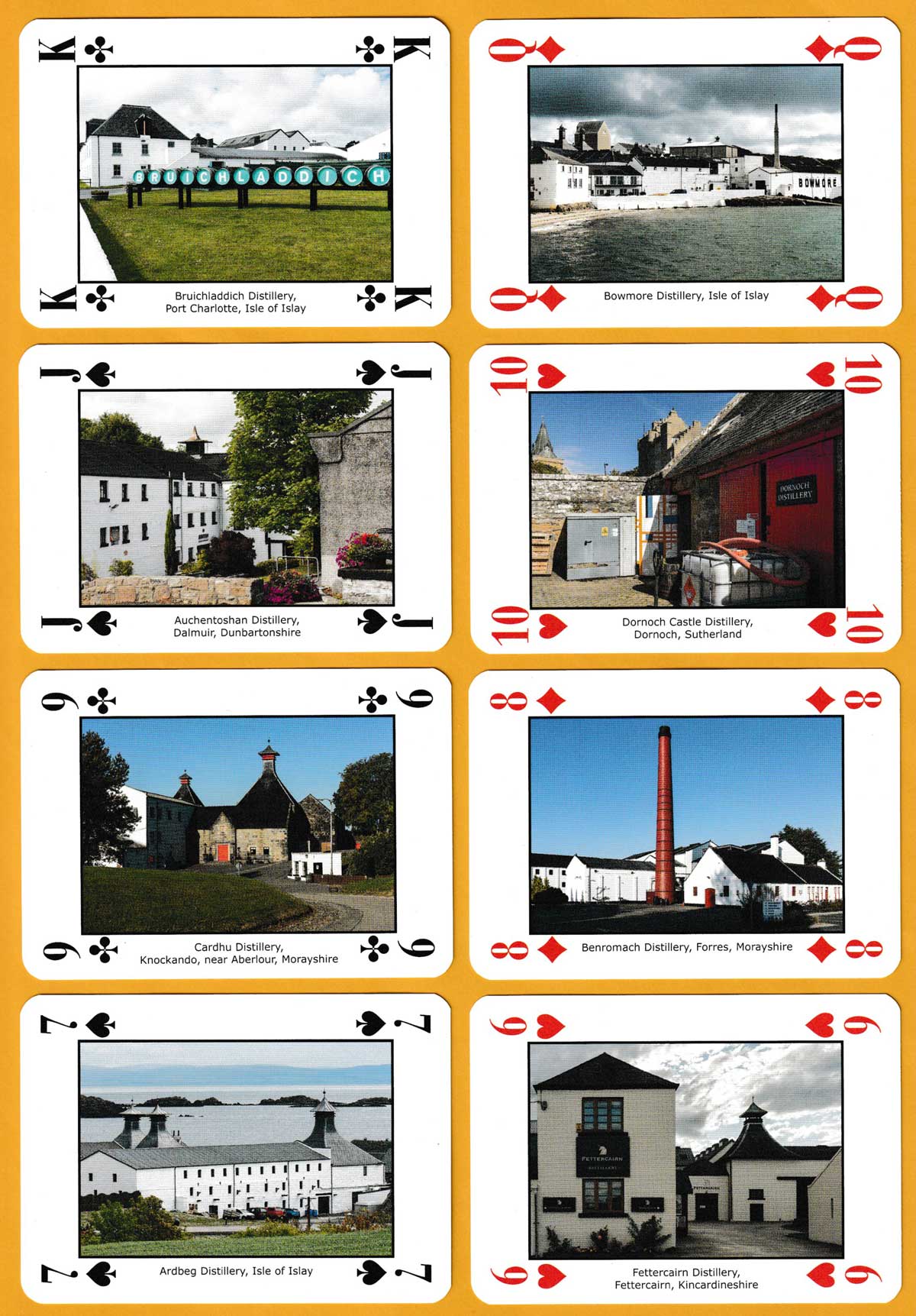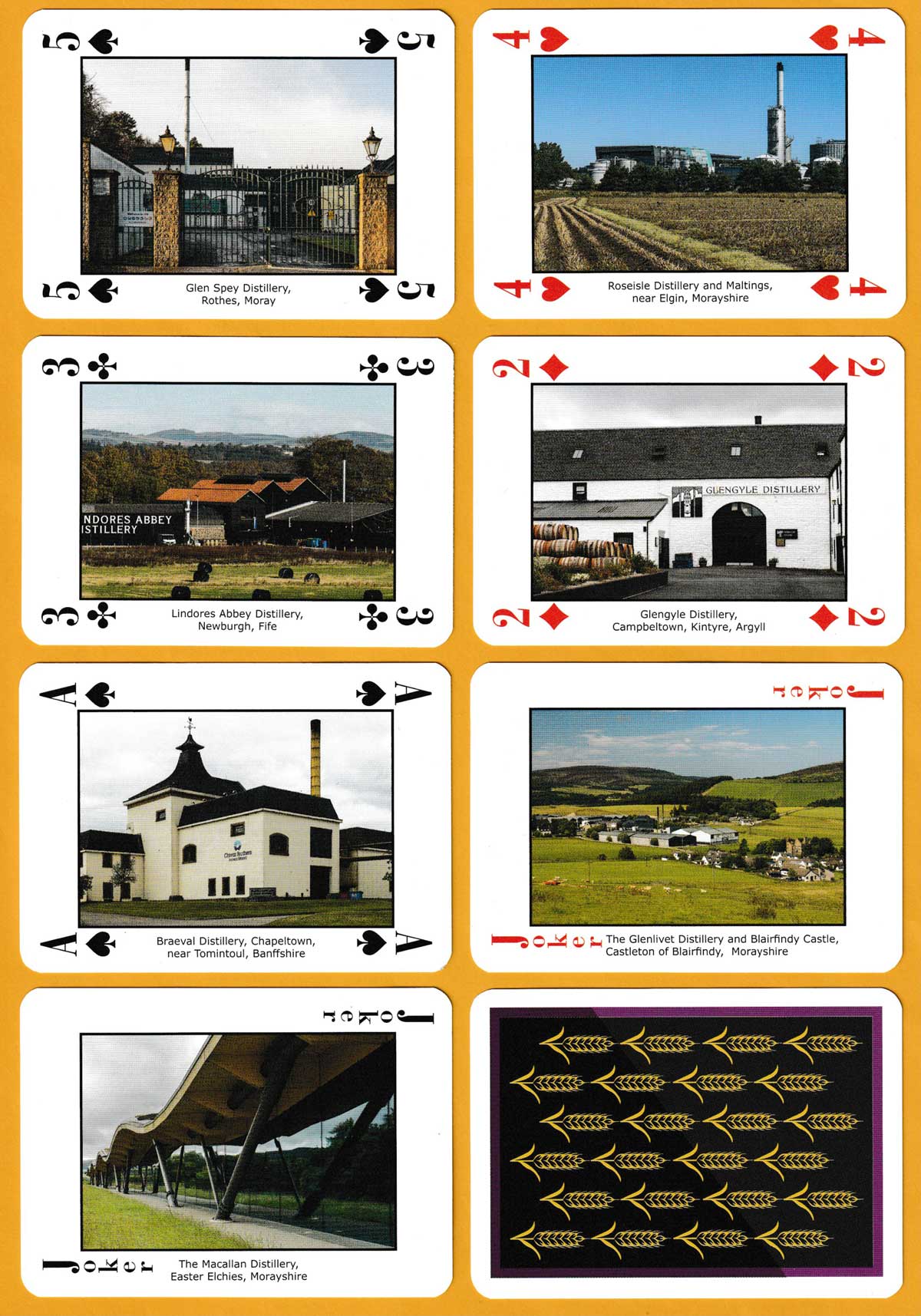 How many malt whisky distilleries are there in Scotland? The answer is more than 150, or more or less the right number to fill three packs of cards. Landscape photographer Duncan McEwan travelled all over Scotland to capture these views of distilleries and associated buildings, old and new. All but two of the images are in horizontal format. The back design is composed of ears of barley (the principal raw material in the production of malt whisky), with a different border colour for each pack. The extra card carries identical explanatory text in all three packs. See the boxes