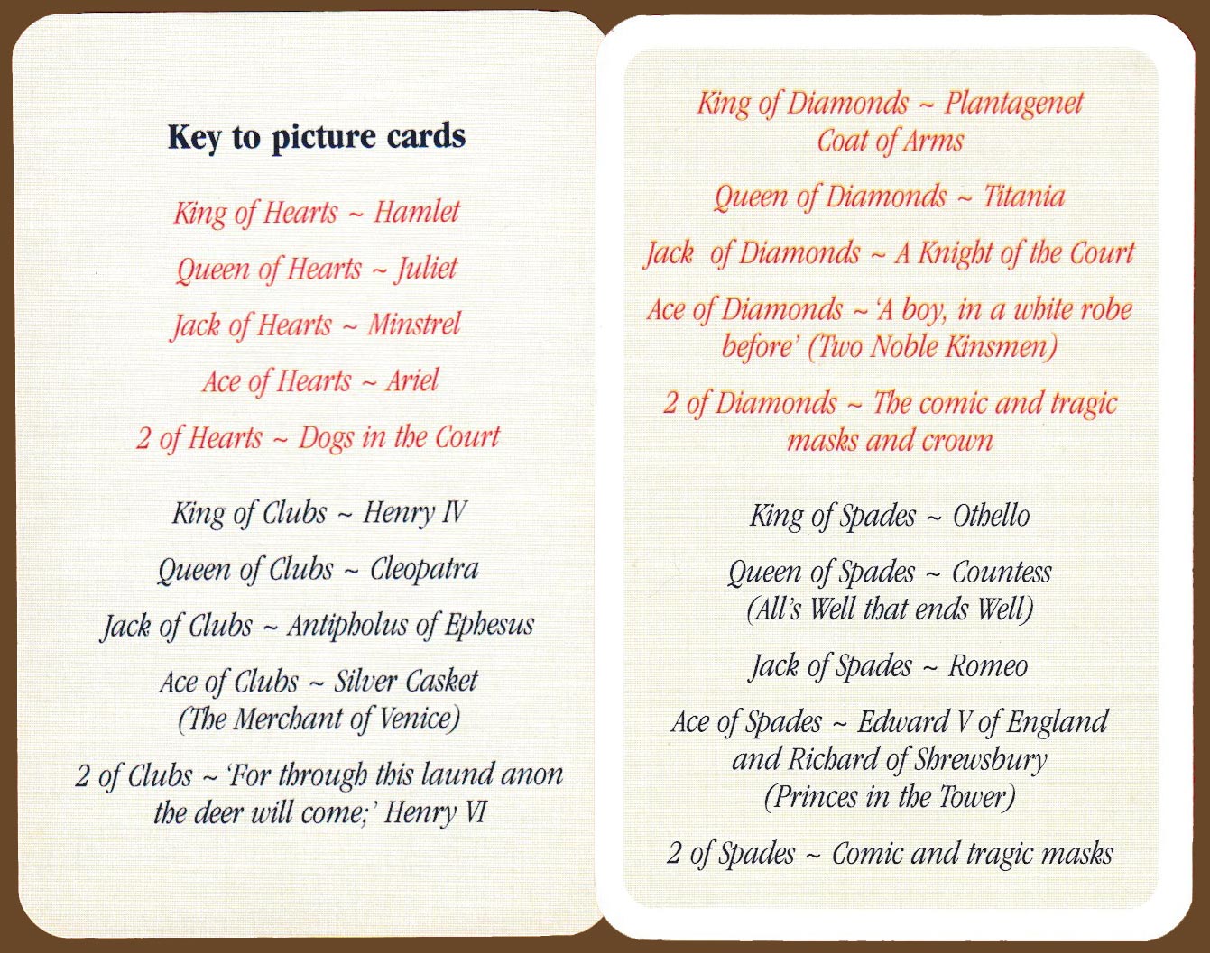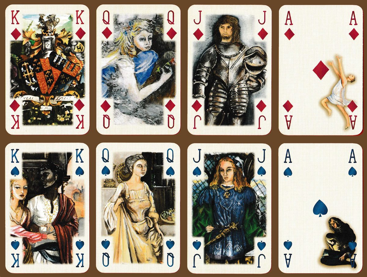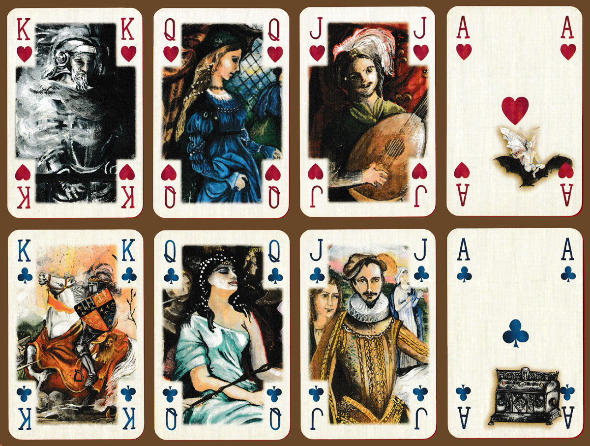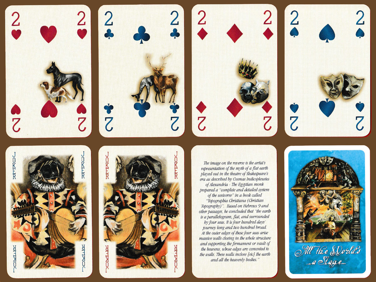 Shakespearean characters seem to hold an eternal fascination for designers of playing cards. These designs by Jane Daniell feature a variety of characters, all listed on the double-sided key card. Some appear to be details from larger works. The Aces and 2s also have small illustrations in one corner. The suit-signs and indices for the black suits are printed in deep blue. Quoting from the second extra card, “The image on the reverse is the artist’s representation of the myth of a flat earth played out in the theatre of Shakespeare’s era as described by Cosmas Indicopleustes of Alexandria”. See the box►