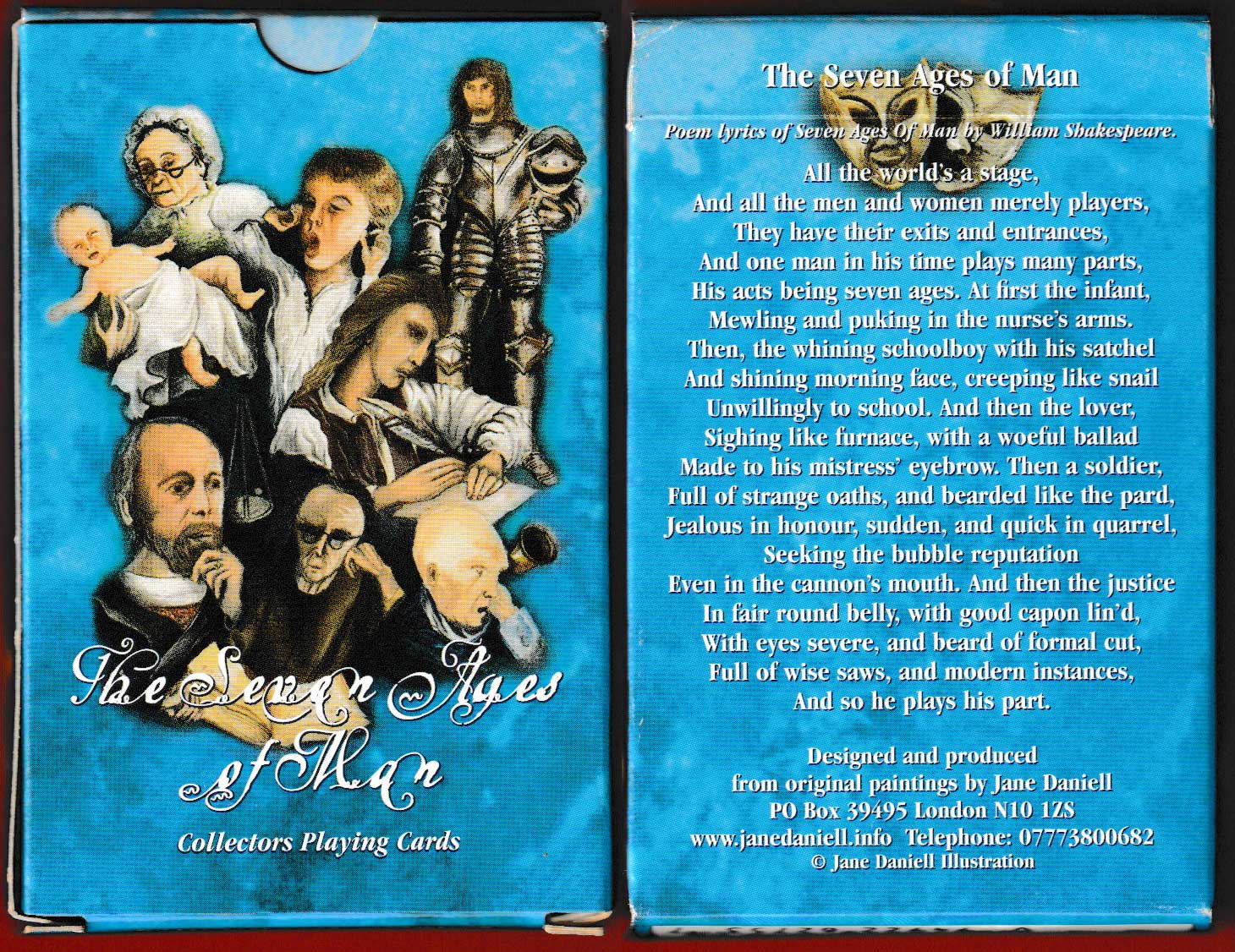 Above: The Seven Ages of Man playing cards designed and produced by Jane Daniell, London, UK, c2007. Printer unknown. 52 cards + 2 Jokers + 2 extra cards in tuck box. Size: 56 x 87 mm. © Jane Daniell Illustration.