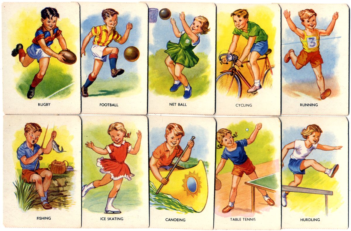 Fishing • Table Tennis • Hurdling • Canoeing • Ice Skating • Running • Net Ball • Cycling • Football • Rugby • Hockey • Tennis • Cricket • Boxing • Tobogganing • Diving • Archery • Old Maid
