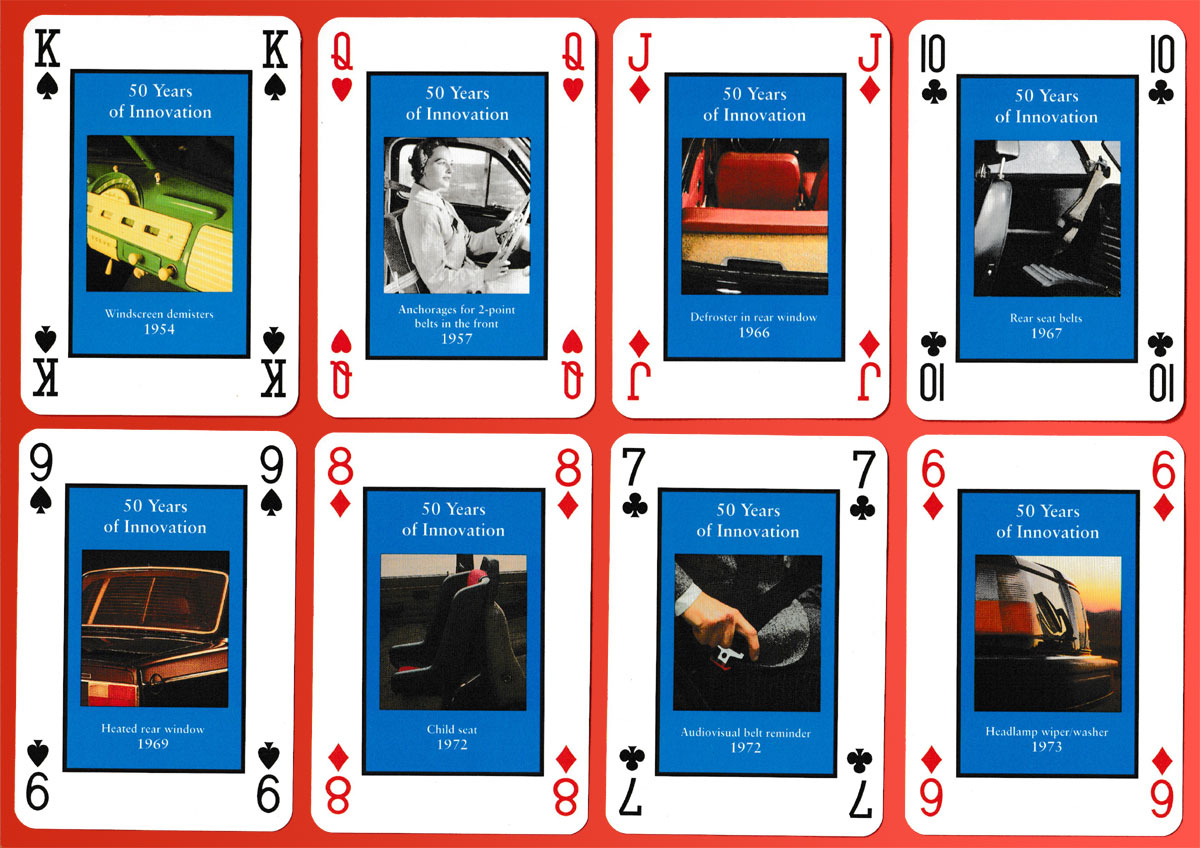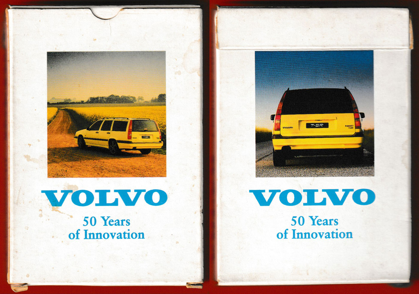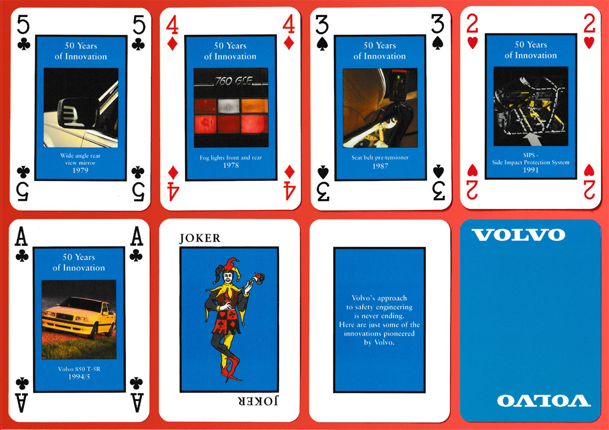 Above: Volvo playing cards made by Carta Mundi, Turnhout, Belgium, for SML Associates, London, UK, c1995. 52 cards + 2 (identical) Jokers + 1 extra card in tuck box. Size: 67 x 97 mm.