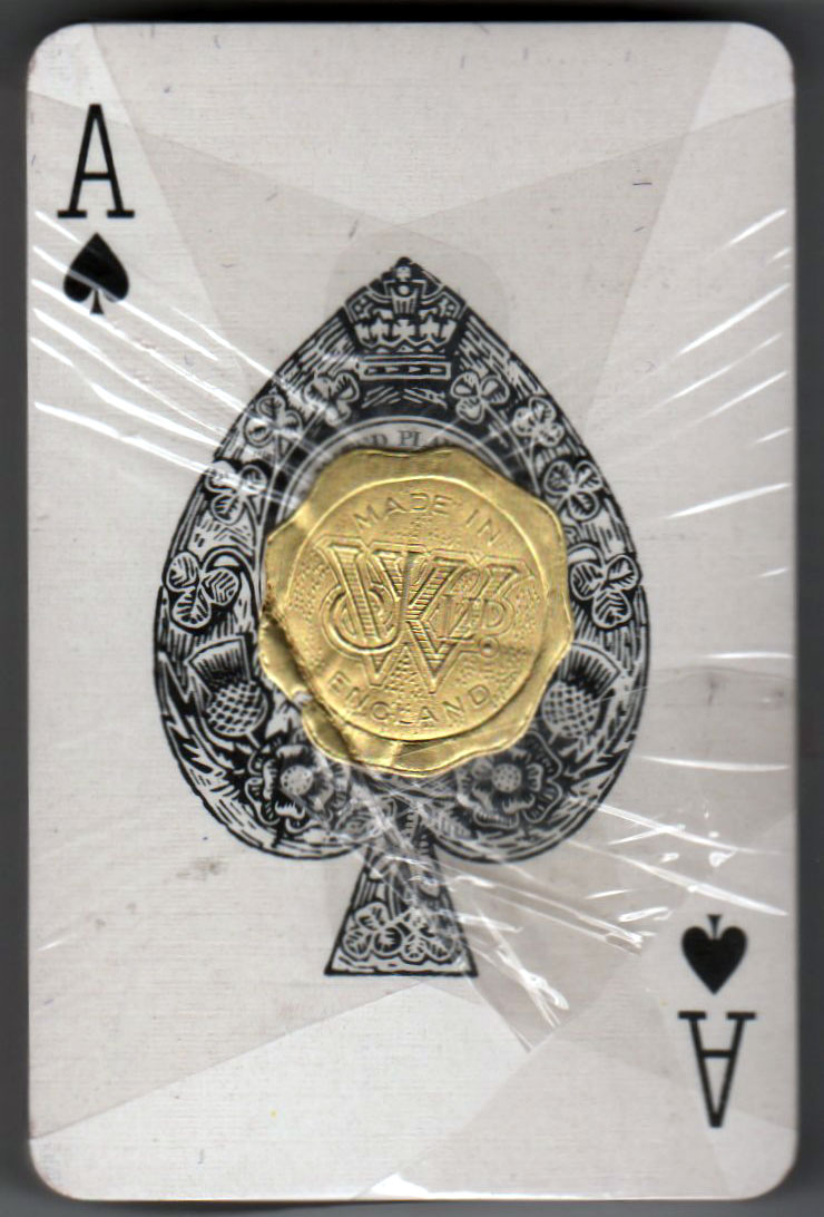 As we know, after the De la Rue factories were bombed during the war in 1940 their cards were printed by Waddingtons. In 1962 Waddingtons and De la Rue combined forces to form the Amalgamated Playing Card Co, but in 1971 De la Rue pulled out of playing cards leaving Waddingtons the sole manufacturer. Here is a double pack produced for an unidentifiable shipping line in which ALL THREE companies come together. One pack has a De la Rue ace of spades, harlequin jokers and complaints slip. The other was sealed with a Waddington’s seal, carries an Amalgamated ace of spades and Waddington’s standard jokers with a De la Rue complaints slip. See the sealed Ace of Spades►