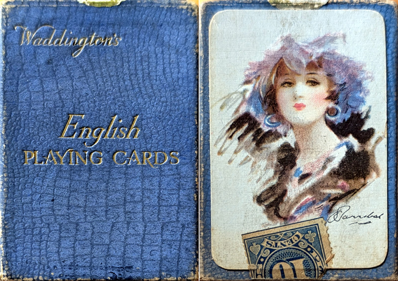 John Waddington Patience from the Barribal Series, c.1929, featuring an early ace of spades design and joker with attractive artwork on the box. The card on the box doesn’t match the cards within so they must have been swapped. Barribal’s back designs from the 1920s are stylish and chic which some city women try to achieve today.