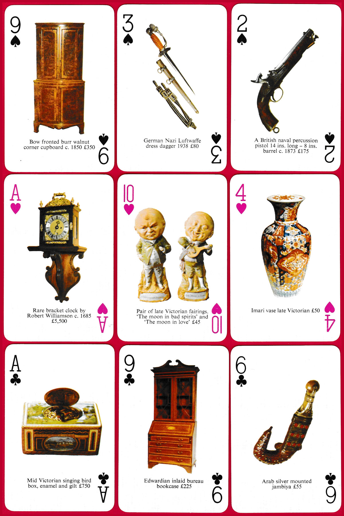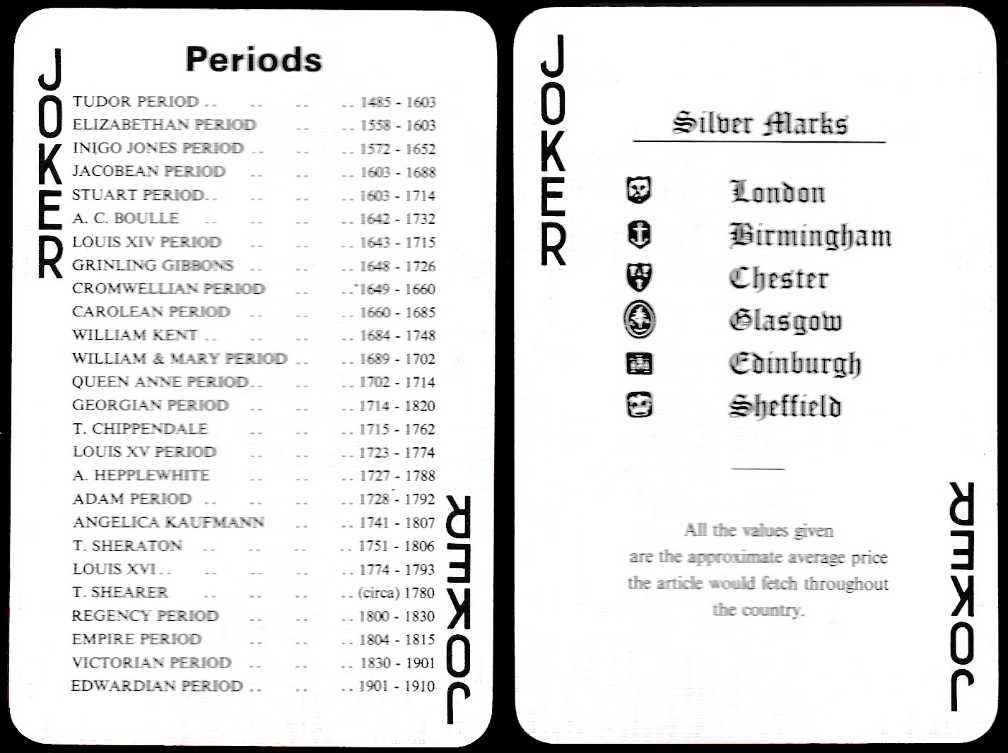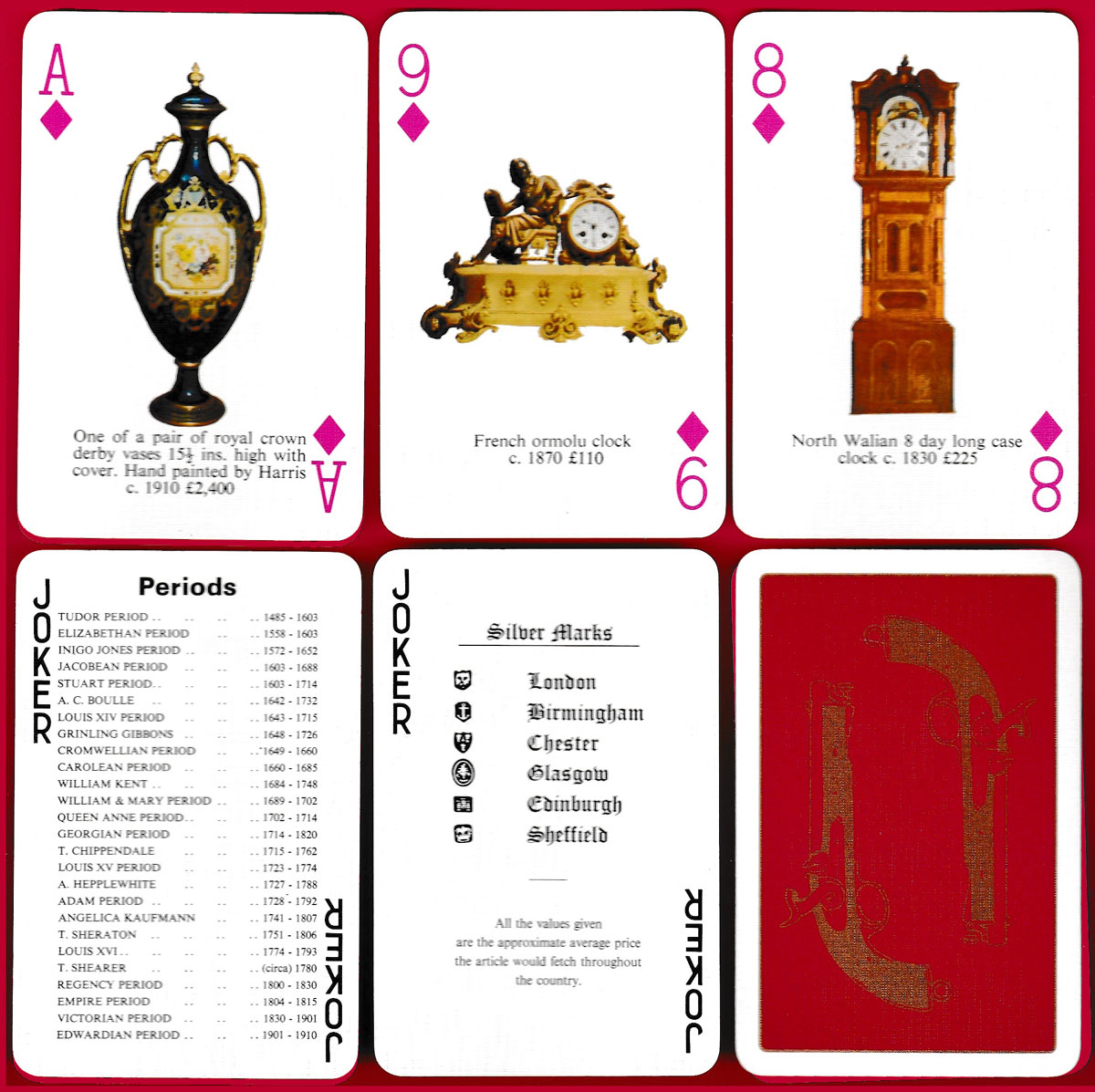 This pack was manufactured and produced for Collectors Cards, Abertillery, South Wales by Waddingtons Playing Card Company, Leeds. Each of the 52 cards displays a different antique – furniture, porcelain, pottery, clocks, glassware, antique weapons, etc. – beneath which is a brief description and an approximate valuation. Two additional information cards serve as jokers: the first lists the silver marks of six major UK cities, and the second lists the historical periods used to help define an antique’s date of manufacture. See the box►