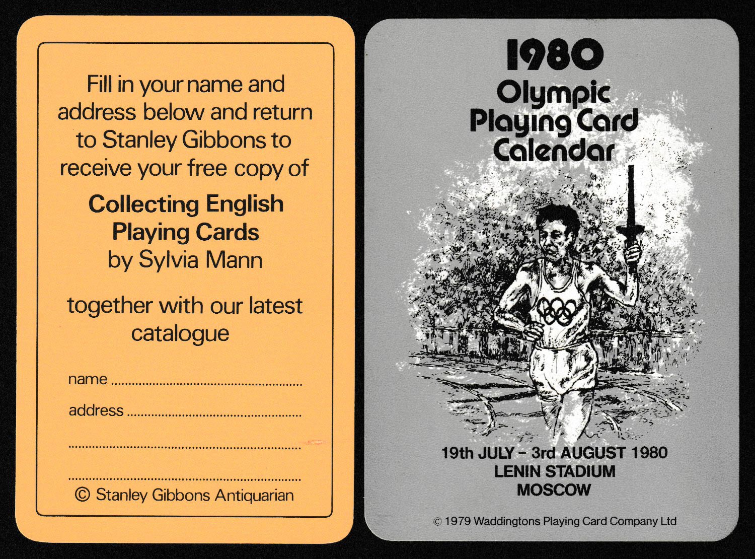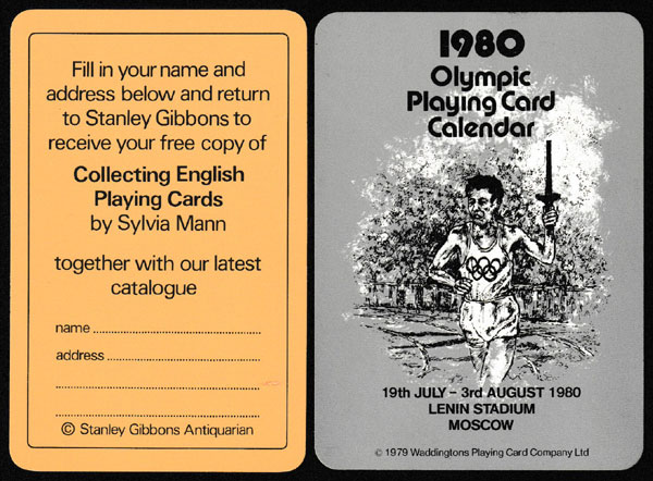 Unfortunately, because of the Soviet-Afghan War, 66 countries decided to boycott the games, though not Great Britain and Northern Ireland. Waddingtons had planned to issue the same designs on playing cards as had appeared on the calendar pack in order to mark the games but at a late stage decided to abandon the project as being commercially unviable. On learning of this, Stanley Gibbons picked up the baton and decided to run with the pack. The double pack was issued less than three weeks before the games began. It was not a commercial success. However, there was a promotional card inside the orange-backed pack (see image) which customers could return to Stanley Gibbons in order to receive a free copy of Sylvia Mann's "Collecting English Playing Cards" together with their latest sales catalogue of playing cards. This was quite successful, attracting a number of new collectors to the hobby. Obviously, many of the packs now in the hands of collectors will be lacking this card. Thus, the extra card in each of the two packs was different - a title card in the black-backed pack and a promotional card in the orange-backed pack.