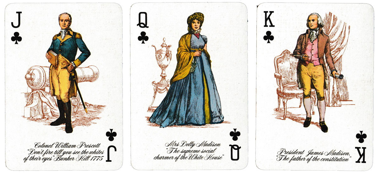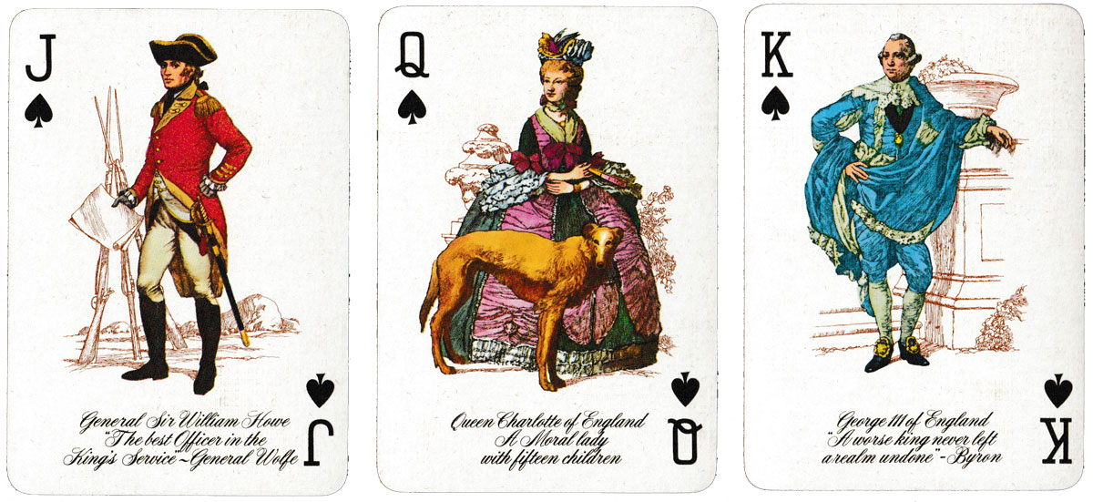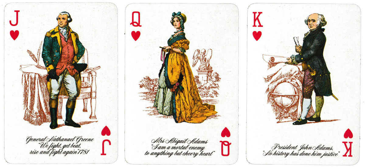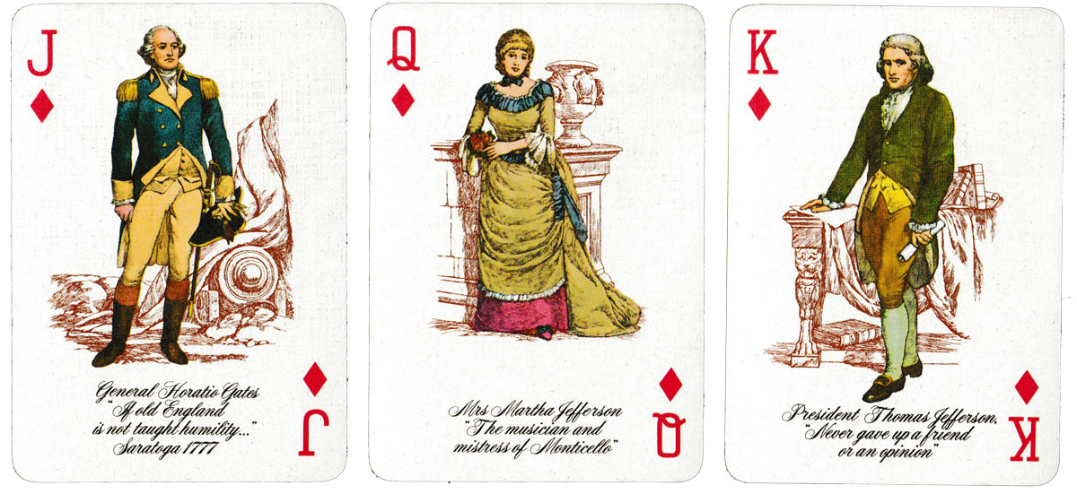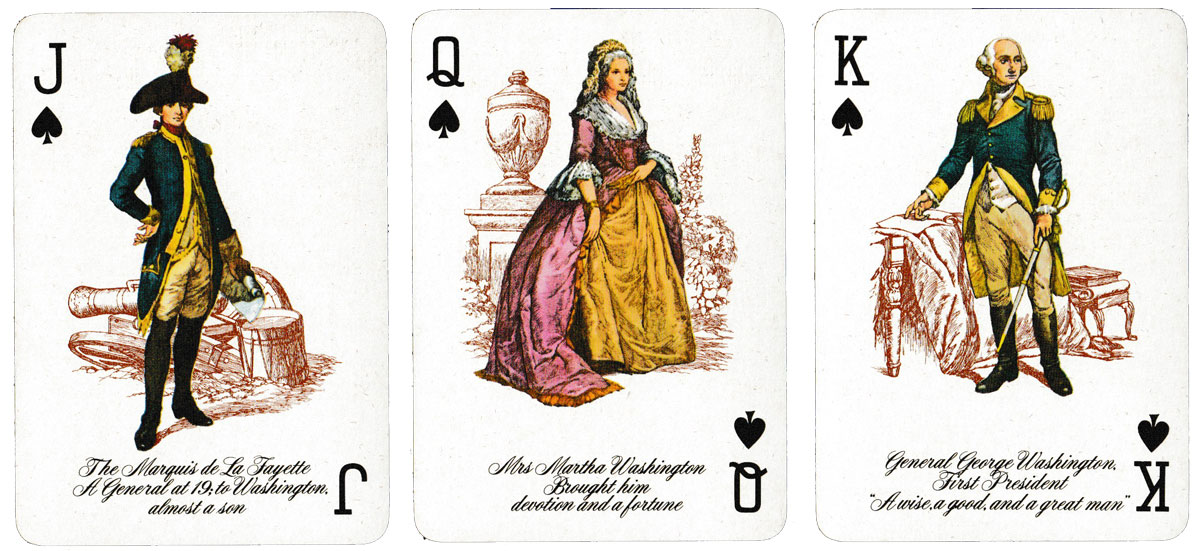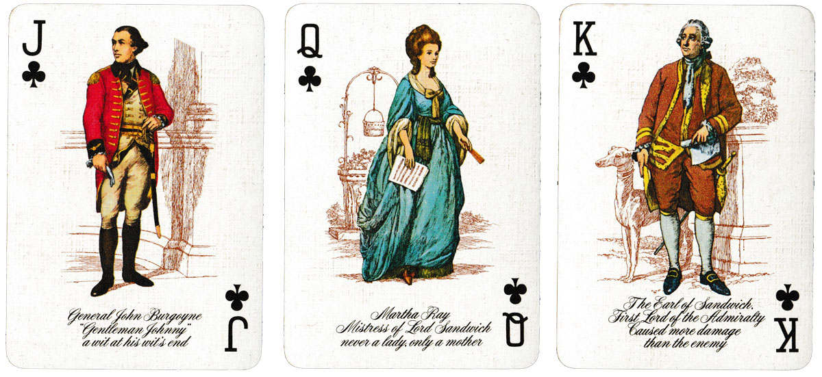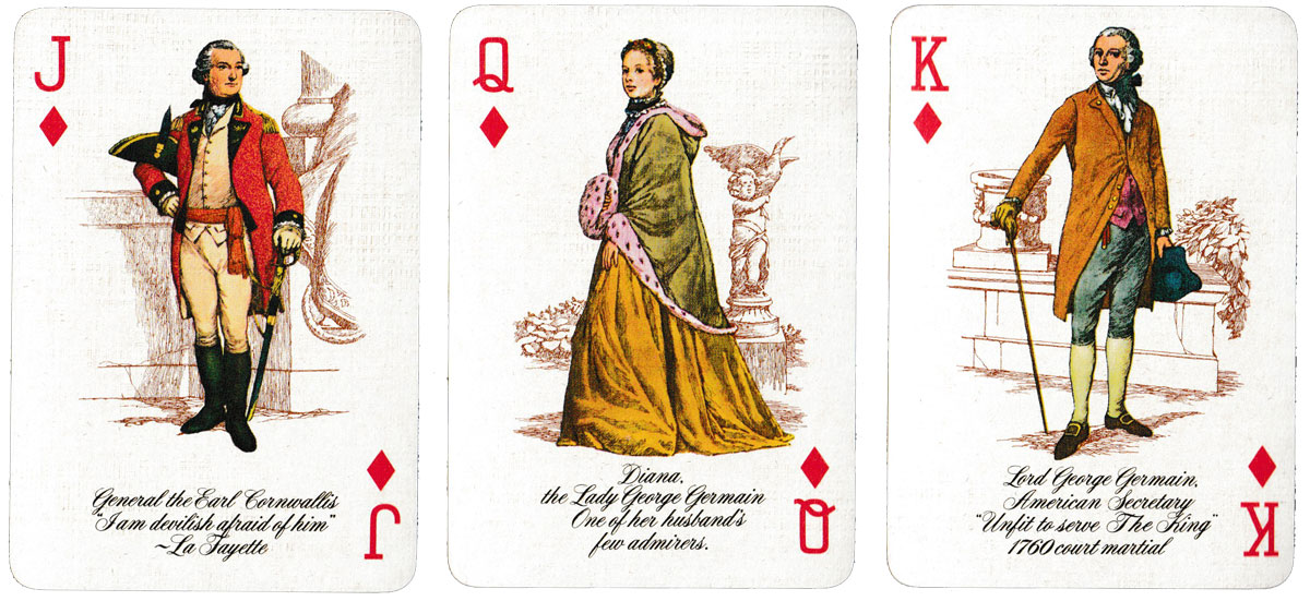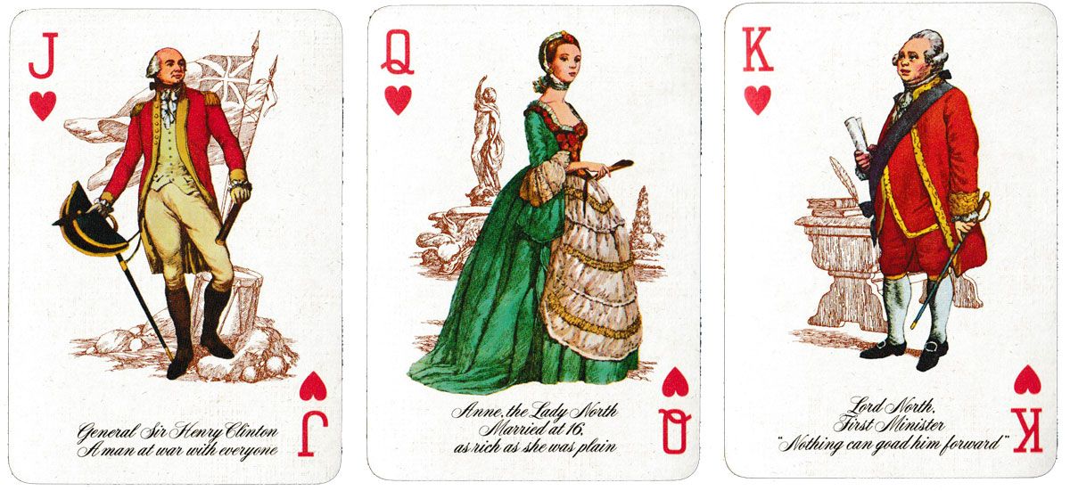 The court cards of each pack show full-length historical figures in 18th century costume with vignette backgrounds sketched in sepia. Each person is named below, together with a quotation by or about them. One pack represents Americans, the other British. Italian artist Gino d’Achille was commissioned to produce the portraits.