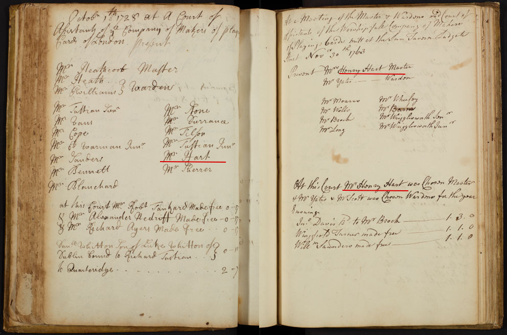 The Court minutes of the Worshipful Company of Makers of Playing Cards record that John Hart became a Court Assistant of the Company in 1728 and that he was Master for the year commencing November 1733. In 1749 he was joined on the Court by John Hart Jr, and in 1761 by Henry Hart. Henry Hart was Master of the Company for the year commencing November 1763.