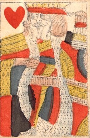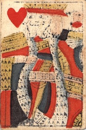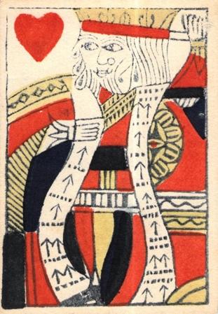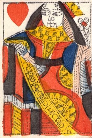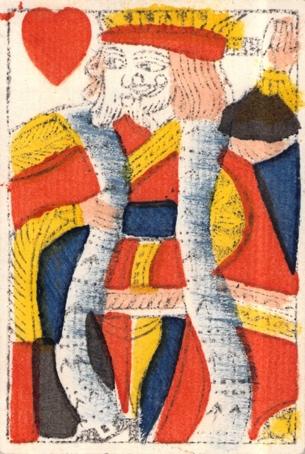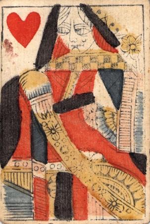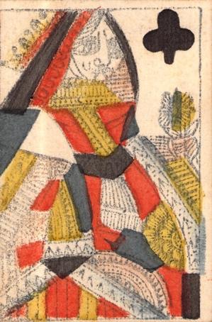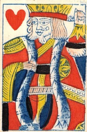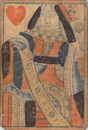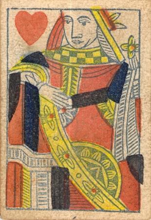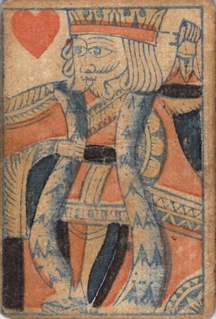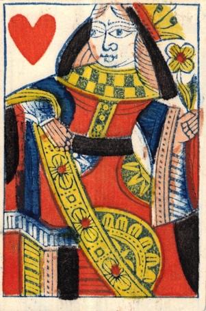 Court cards naturally differ between makers to some extent, but always within the context of the generally understood ‘standard’. Here some of the Hart cards use designs and colours that are not typical of English cards of this period. ‘A16’ has no blue colouring, for example, and the style is qualitatively more like later American cards. The delineation of faces of ‘A28’ is much clearer than the known English cards, and the eyes have no outline which is highly unusual. ‘A29’ could certainly be English, but its design would fit better with cards of the next decade or so.