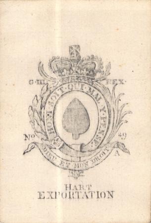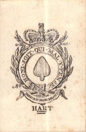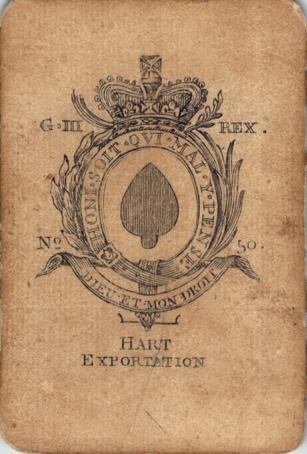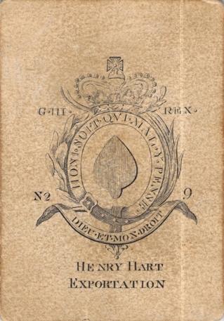 In 1763, Henry is listed in London’s ‘Universal Directory (Mortimer)’ for the first time, having premises at Lambs Conduit Street (Red Lion Square) in London. It is likely that the business had in fact been going for some time previously. In 1765, the first English “tax aces” were introduced. From this year on, every ace of spades was printed by the Stamp Office and carried the name of the card maker. The maker had to buy these aces by the sheet from the Stamp Office, thereby paying the tax. Hart was one of six card makers who registered in 1765 to have these aces made. The Stamp Office also offered exportation versions of the aces. These were similar in appearance, but no duty was payable on cards exported. Hart was one of five card makers registered for exportation aces.