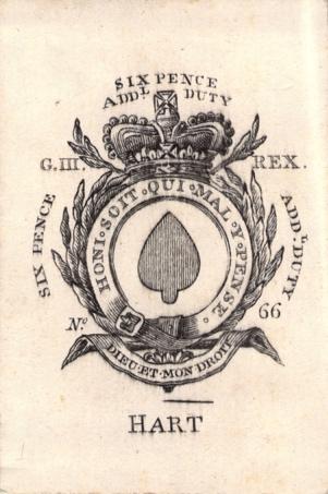 In 1776 the duty increased and the ace of spades was re-designed to show the additional 6d duty paid. The same year, two card makers were bankrupt (possibly as a result of the increased duty). Hart registered in 1776 for the new ace. In 1789 the duty increased again and we have an example of Hart’s ace showing this later duty – additional 6d duty twice over. Hart was bankrupt in 1797. It is likely that he died in 1801, the only potential match in the burial records. He would then have been 85.