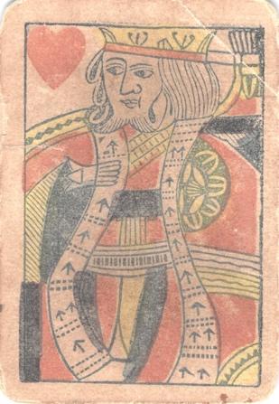 Note the perfect up-down symmetry! While the court cards are still full figures that can only be viewed one way, the pip cards look the same if they are turned upside-down. None of the Hart cards has reversed pips.