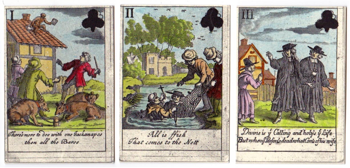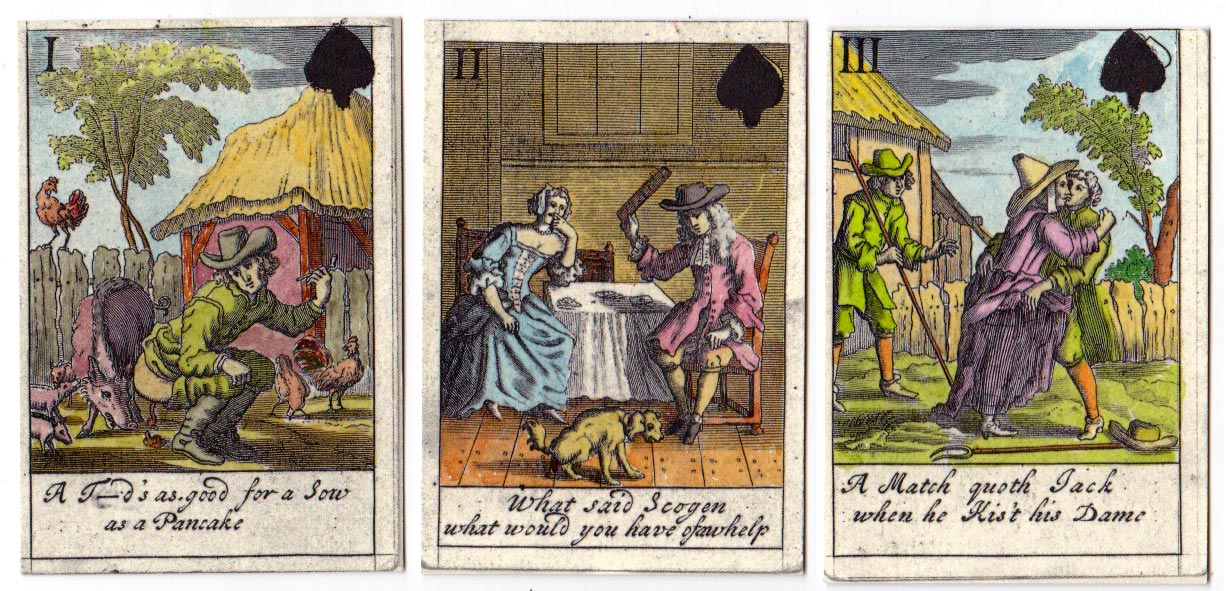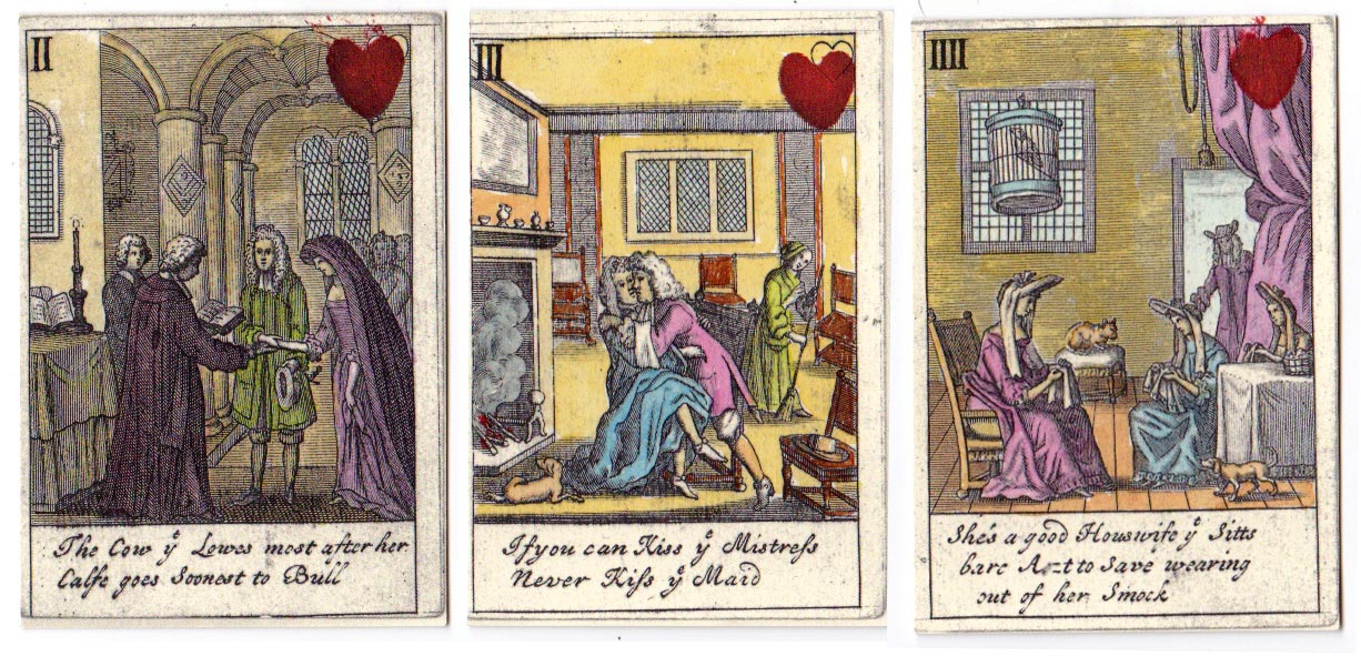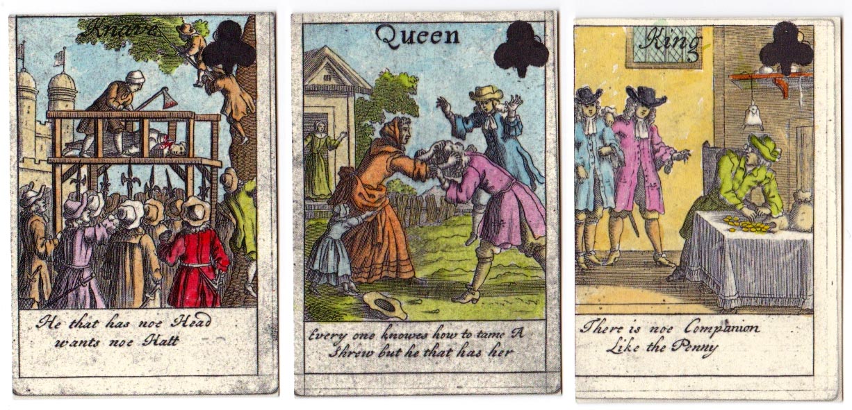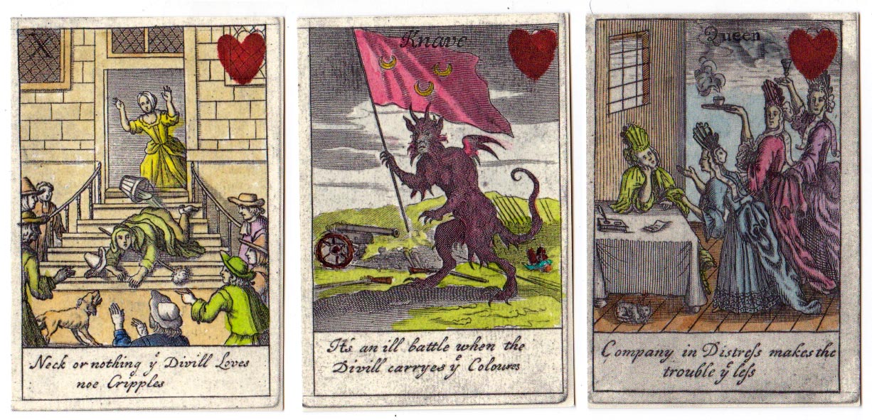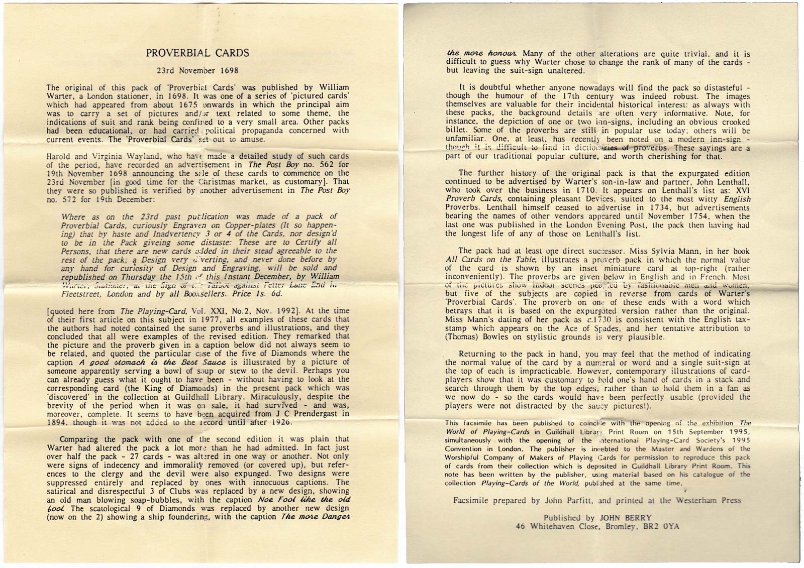 Above: cards from a facsimile edition of 'William Warter's Proverbial Cards' (1698) published by John Berry, Bromley, 1995. The original cards are printed from copper-plate engravings (uncoloured) with suit marks stencilled in the corners.