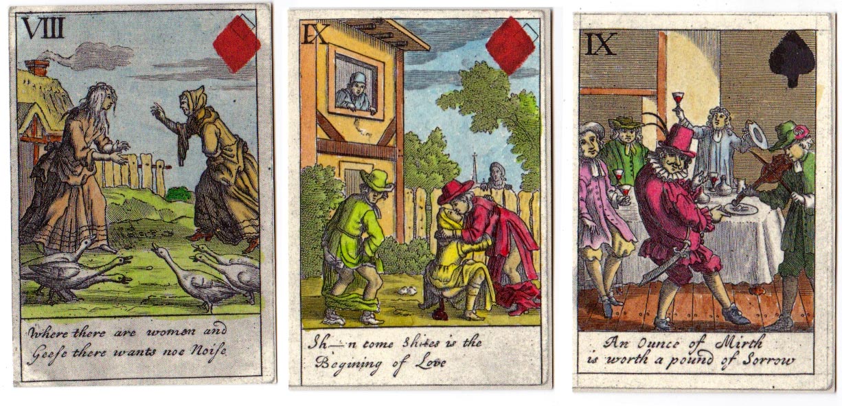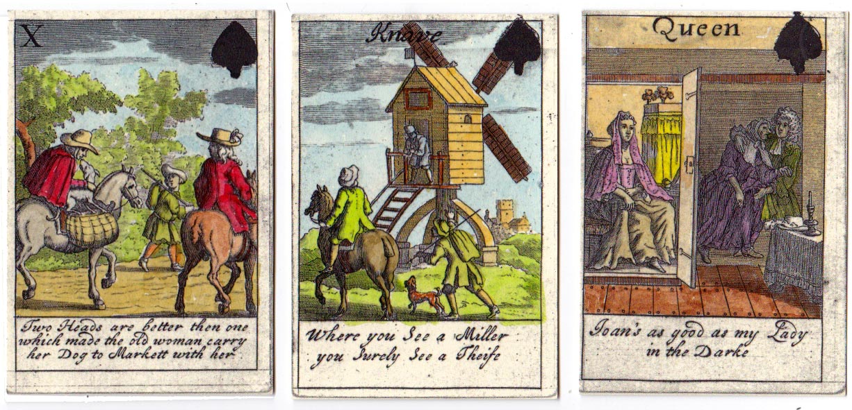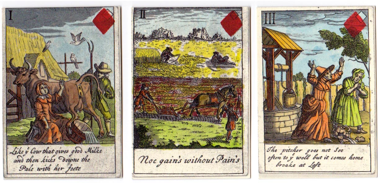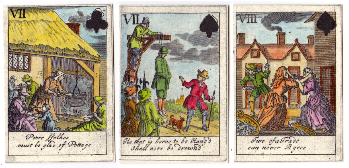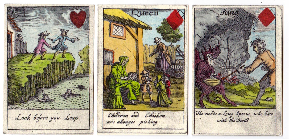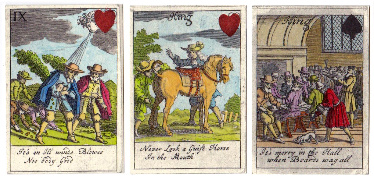 The images on the cards are of historical interest as illustrations of late 17th century life. The proverbs are part of our traditional popular culture, well suited to a pack of playing cards!