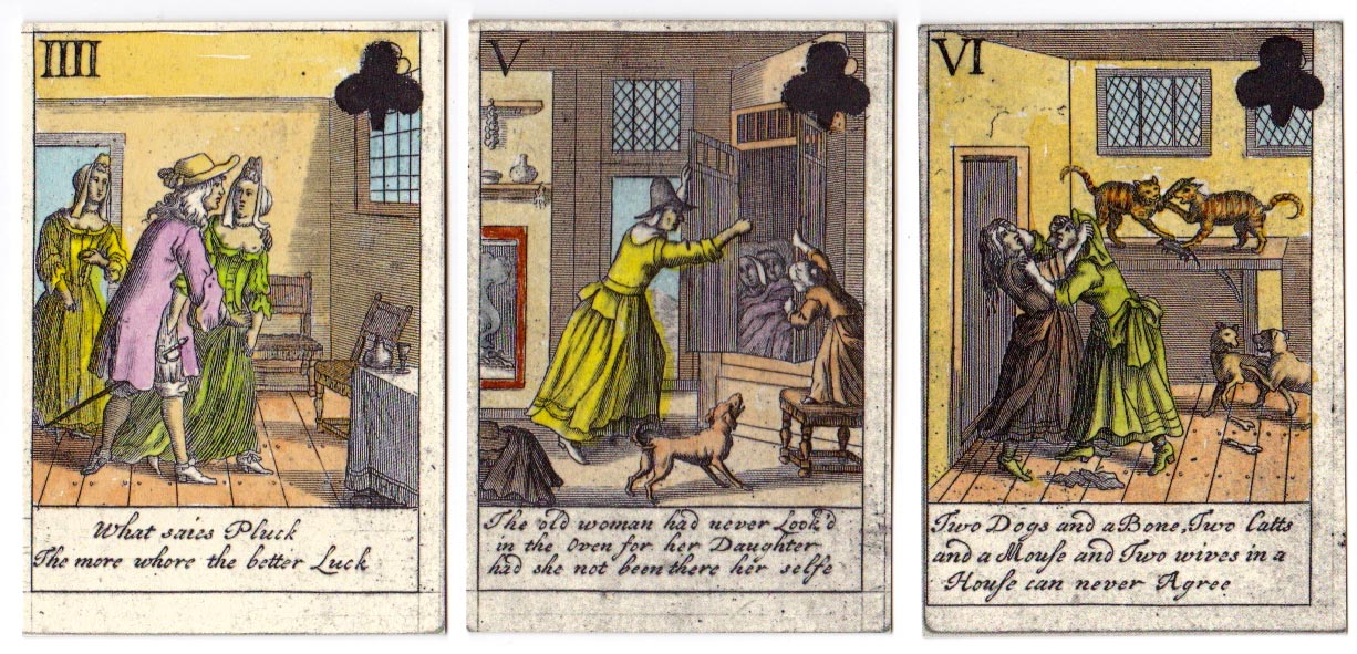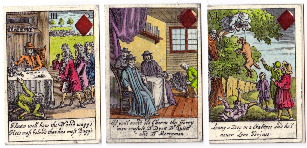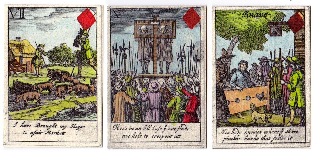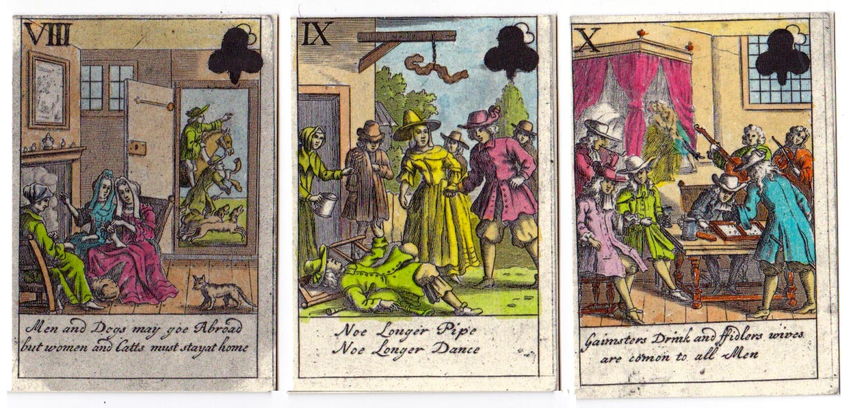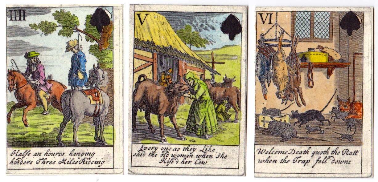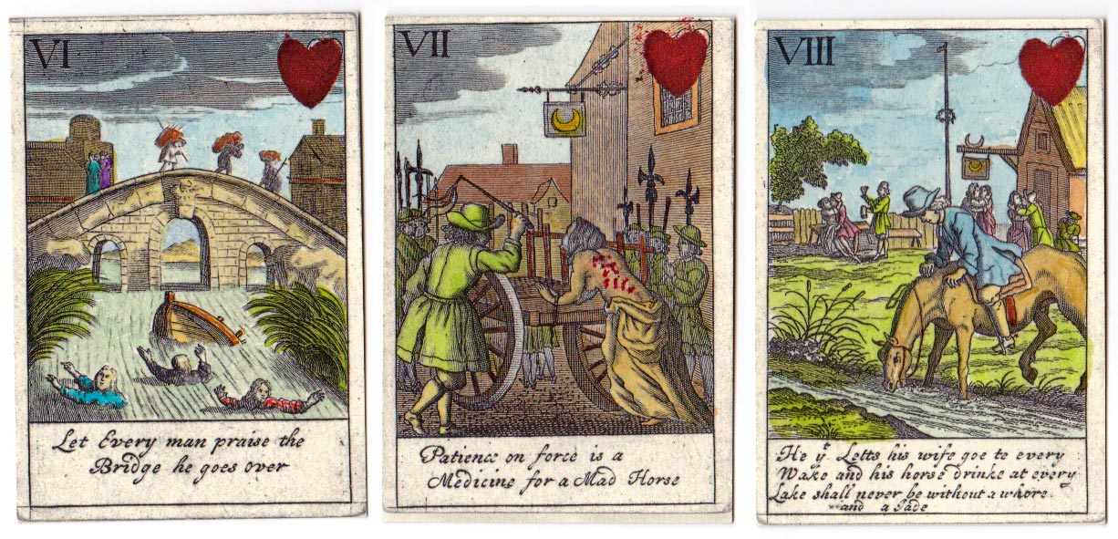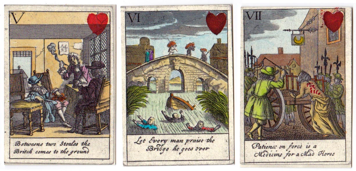 The images on the cards are of historical interest as illustrations of late 17th century life. The proverbs are part of our traditional popular culture, well suited to a pack of playing cards!