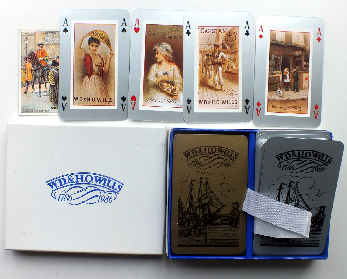 Above: double pack commemorating the 200th anniversary of W.D & H.O. Wills Ltd, 1786 - 1986. Each deck has 52 cards + 2 Jokers plus an insert card that describes the decks, inside a presentation case. One pack has silver borders and backs, the other has gold borders and backs.
