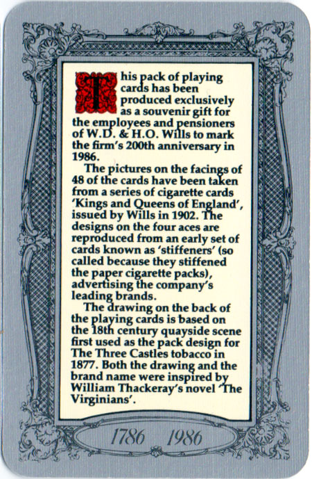 Double pack commemorating the 200th anniversary of W.D & H.O. Wills Ltd, Bristol (1786 - 1986) and presented to all their employees and pensioners. The four aces are reproduced from an early set of ‘stiffeners’ (so called because they stiffened the paper cigarette packs), advertising the company’s leading brands. The rest of the pack features cigarette cards. See the Explanatory Card►