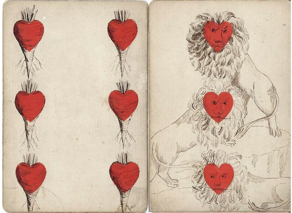 Transformation playing cards, first published in 1811. Each card bears a picture in which the suit m...