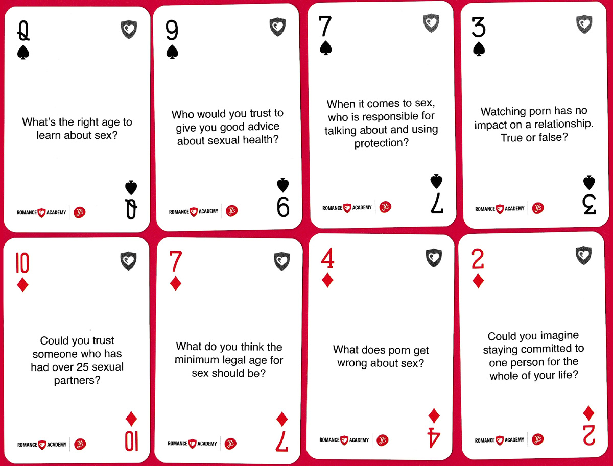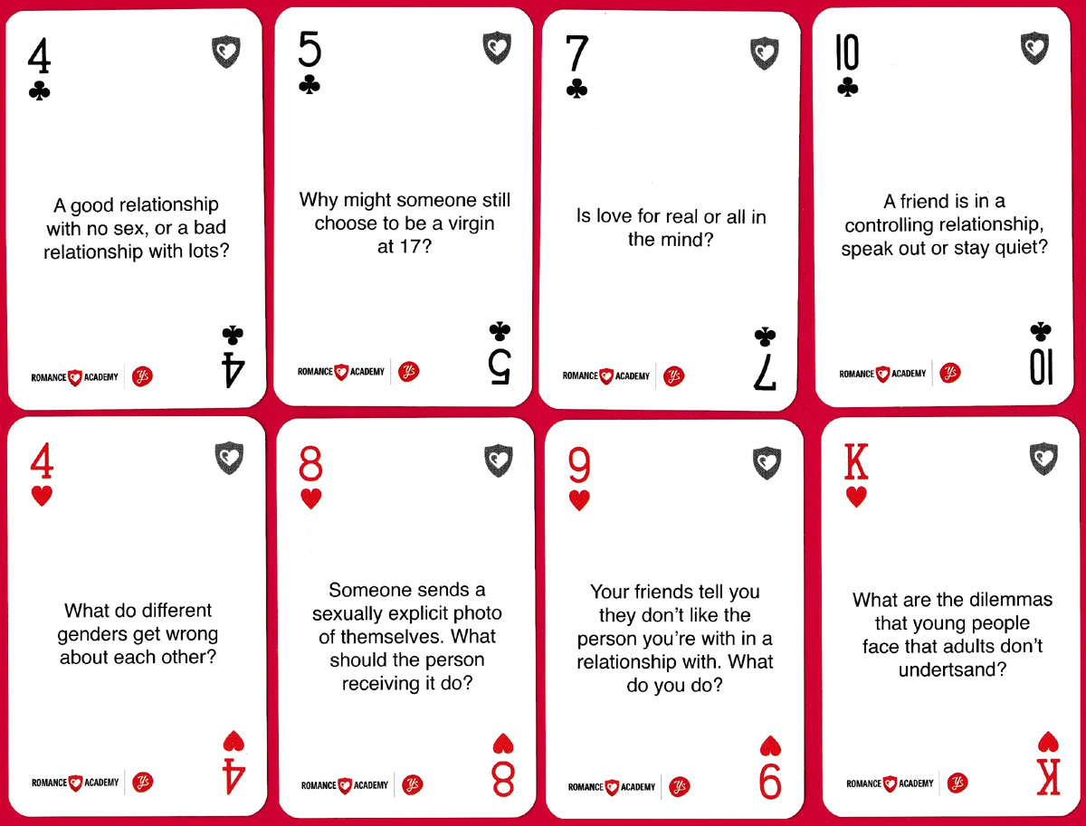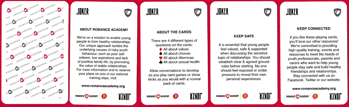 The intention behind these cards is to help 14-19 year olds conduct healthy conversations about sex and relationships in an intelligent and accessible way. Based on a normal pack of playing cards, each card asks a question with the aim of stimulating further discussion. Each of the 4 suits represents a topic: Values (diamonds), Choices (spades), Dilemmas (hearts), and Sexual Health (clubs). There are four jokers: two provide advice: Keep Safe and Keep Connected, and two offer information about the cards and Romance Academy.