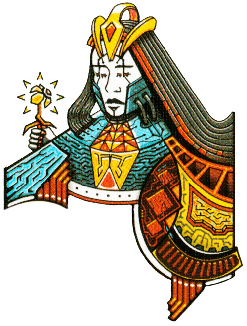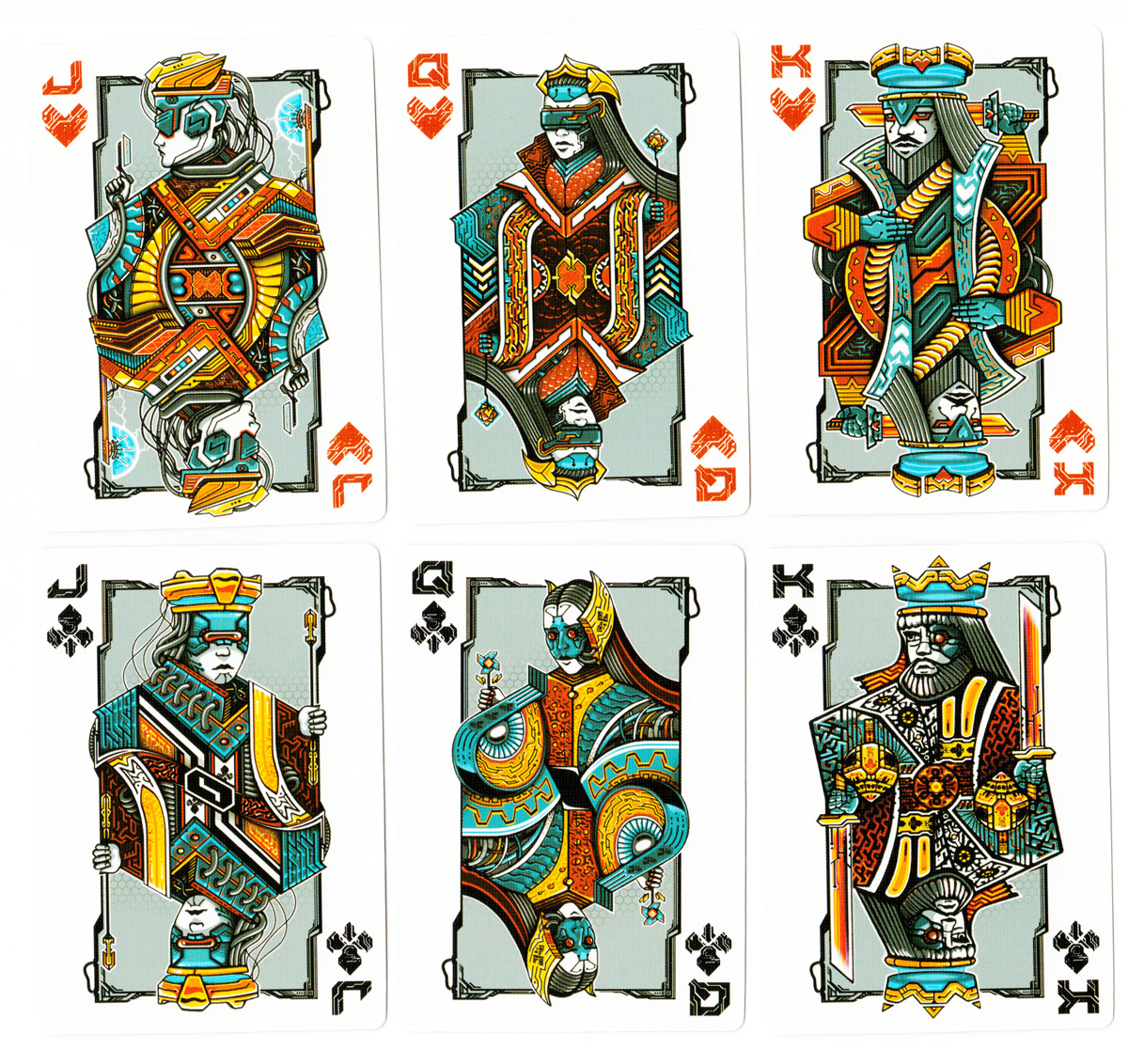 All the courts are reimagined approperately for the cyberpunk genre, Fortunov notes "during the design process of the court cards, I tried to keep as close as possible to their contemporary interpretation regarding facing directions and props", which results in the courts being instantly regonisable whilst unique.