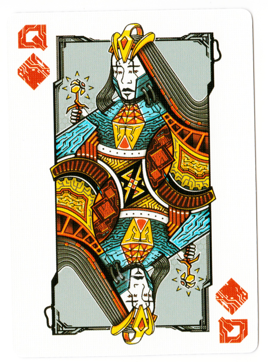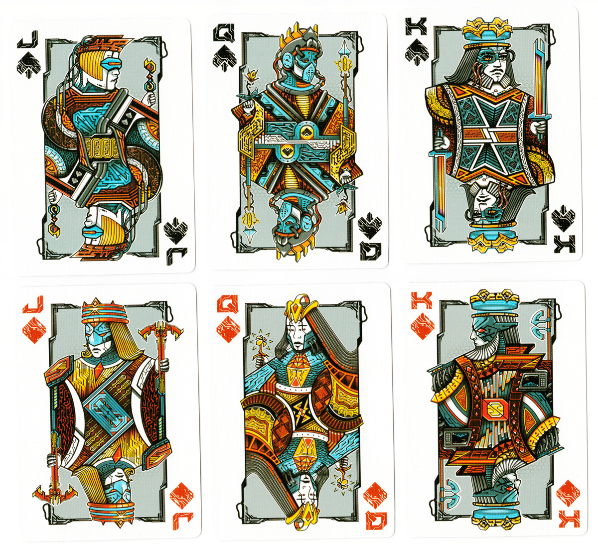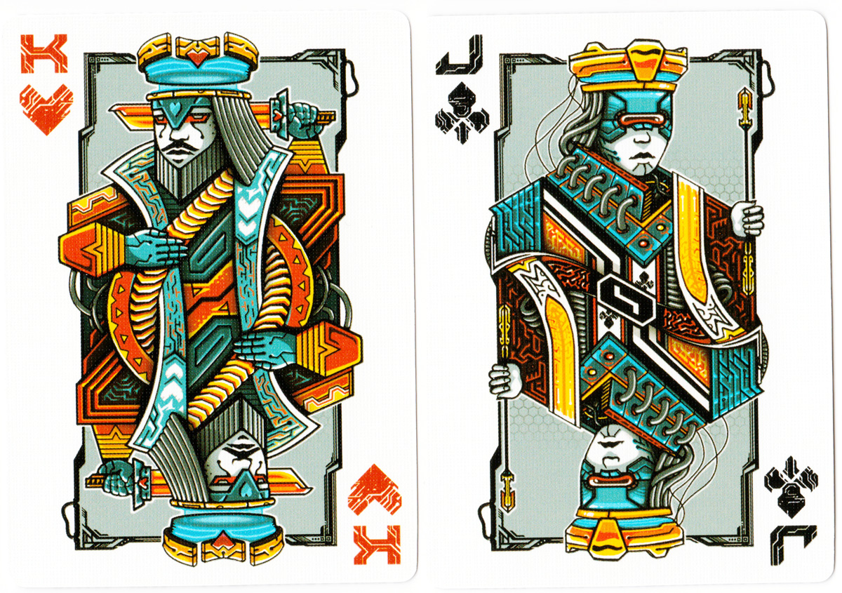 Cyberpunk is a subgenre of science fiction in a dystopian futuristic setting that tends to focus on a “combination of low-life and high tech“. When the cyberpunk genre is applied to playing cards it results in hi-tech pips and cybernetically enhanced courts.