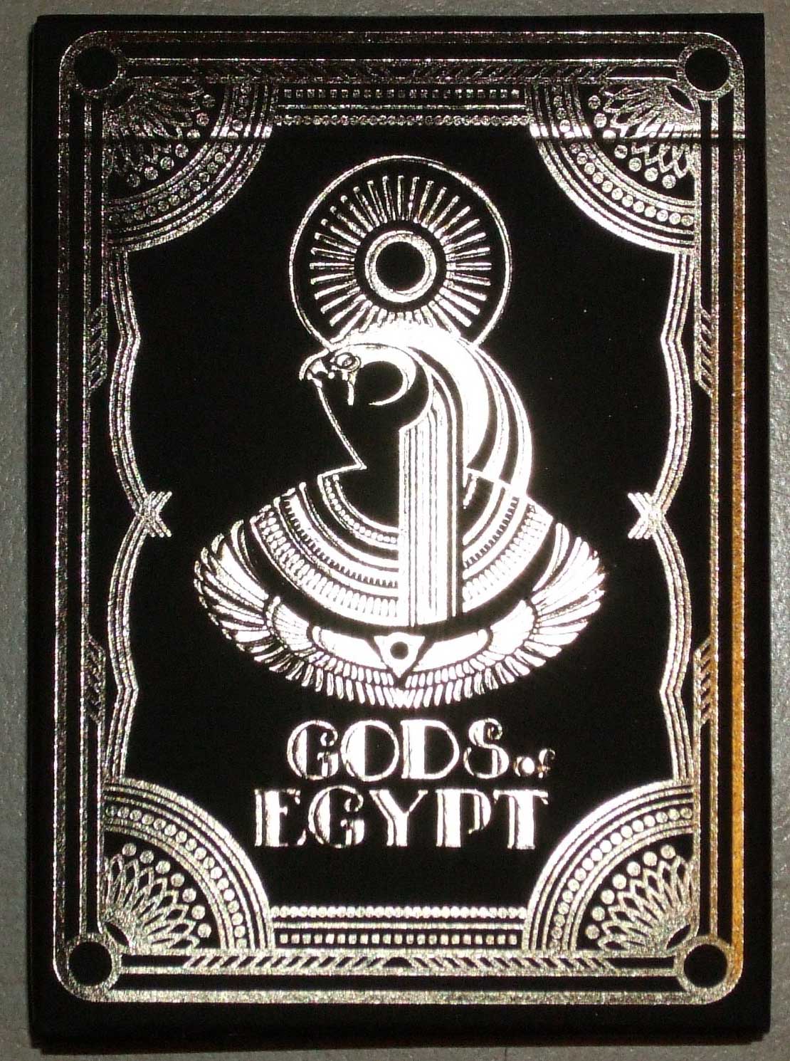 Above: Gods of Egypt are supplied in a quality matte black tuck box with hot foil embossed decoration (no printing) and sealed with a custom paper seal. The pack is comprised of 52 cards plus three jokers, printed on high quality, embossed, paper with metallic silver border and highlights. Typically of SPCC produced cards, the cards feel and handle similar to Bicycle packs and will probably appeal to card magicians wanting a more theatrical pack perhaps for a themed trick.