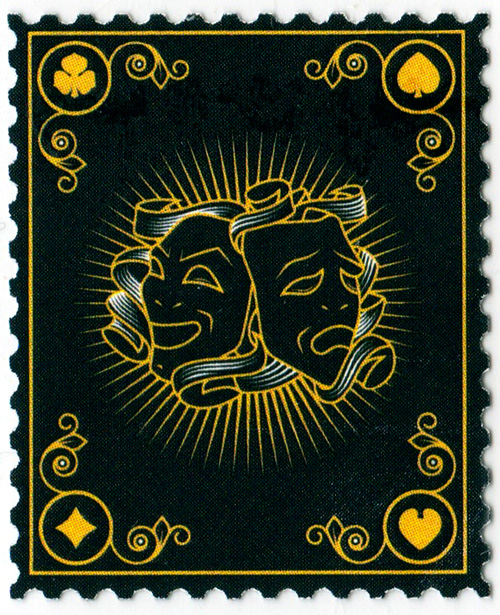 Above: the tuck box seal, features the comedy and tragedy masks of theatre which pays homage to Shakespeare's iconic plays.