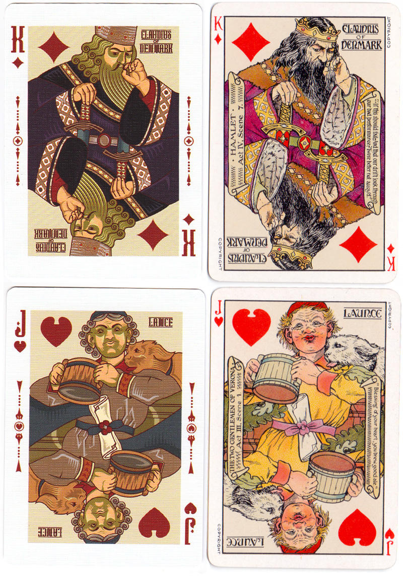 Above Top: the King of Diamonds featuring King Claudius from Shakespeare's tragedy Hamlet; Above Bottom: shows Friar Laurce on the Jack of Hearts from Shakespeare's play Romeo and Juliet, with the Maksym Lebedyk version on the left and Colin Tilney version on the right.
