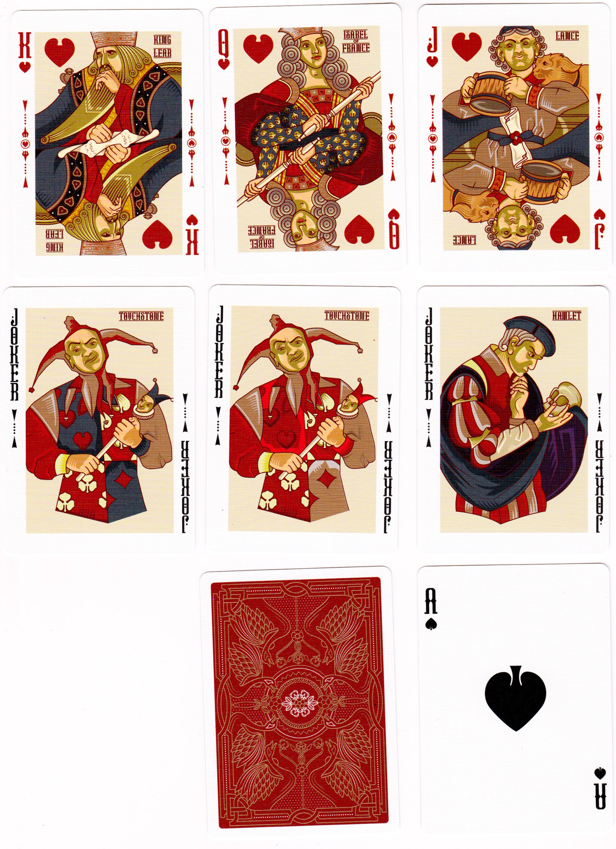 The pack contains 52 playing cards and three jokers, two featuring the character Touchstone the jester and one of Hamlet.