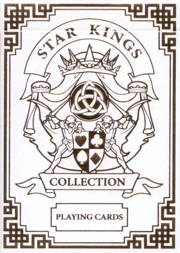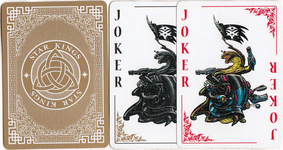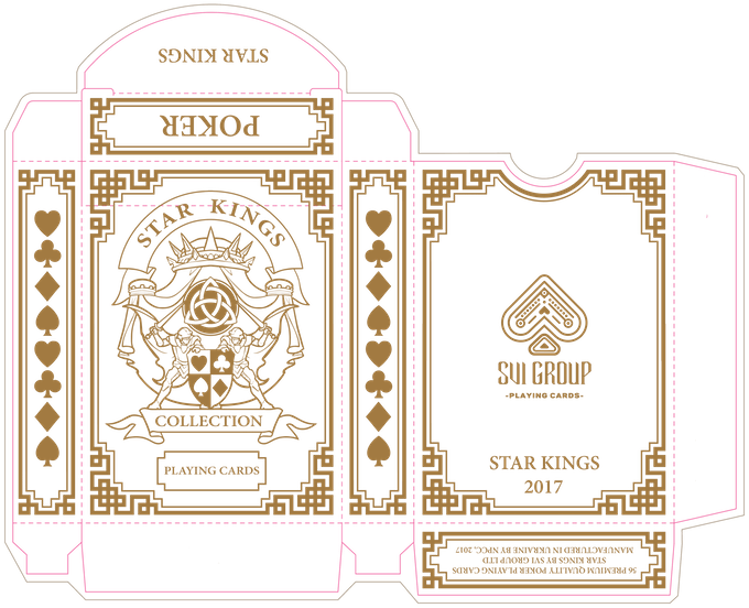 Star Kings custom playing cards, inspired by space opera, were conceived by Serhii Sheludchenko, author of the science fiction novel “The Chronicles of Star Frontiers”. The cards were published in 2017 by SVI Group, a team of creative artists, writers, engineers and travelers with an interest in playing cards. The design includes internally decorated suit symbols and gold decorations. Decks come with either white or black backgrounds.