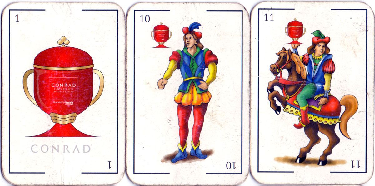 Playing Cards in Uruguay employ Spanish suit symbols: cups, swords, coins and clubs (termed copas, espadas, oros and bastos).