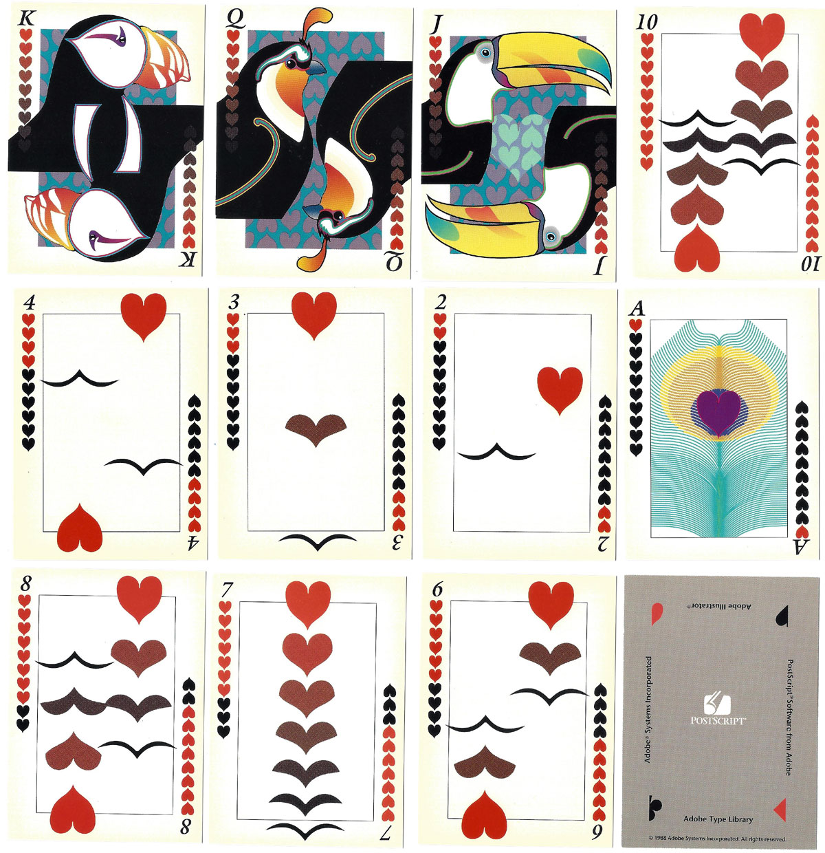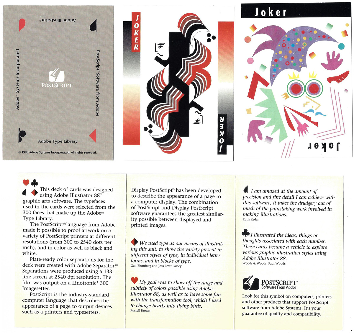 In 1988, Adobe Systems decided to showcase their emerging graphics tools and technology. They created the first-ever digitally produced deck of cards. The deck was designed using Adobe Illustrator 88™ software, the typefaces were from the Adobe® Type Library, the artwork was transmitted to printers for printing using Adobe Postscript®, and Adobe Separator™ was used to create the plate-ready separations. The deck was produced as a corporate give-away for the 1988 Comdex Show.
