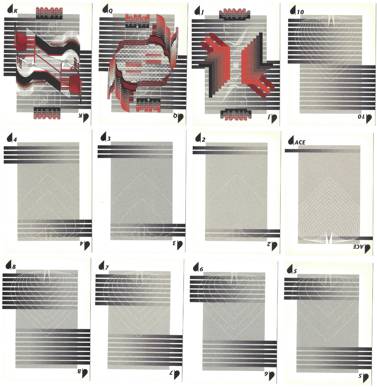 Ruth Kedar designed the spades suit and a joker; Paul Woods designed the clubs and the second joker; Russell Brown designed the hearts and Gail Blumberg and Ross Parsey designed the diamonds.