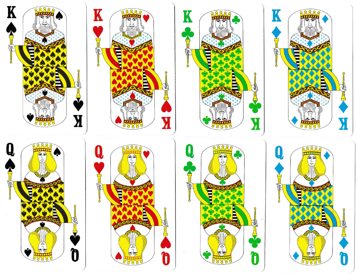 Produced by the Graphics Center Inc., Bloomfield, CT in 1977, this pack has four differently coloured suit symbols: green clubs, red hearts, black spades and blue diamonds. Such packs are often called no-revoke (or non-revoke) as the idea is to make the suits more easily recognizable during play. But unlike most other no-revoke packs (e.g. Hesslers enhanced, Arpak, Spectrum bridge, or Non-revoke) the court cards are non-standard, dressed as royalty in colourful medieval costume reflecting their suit colour.