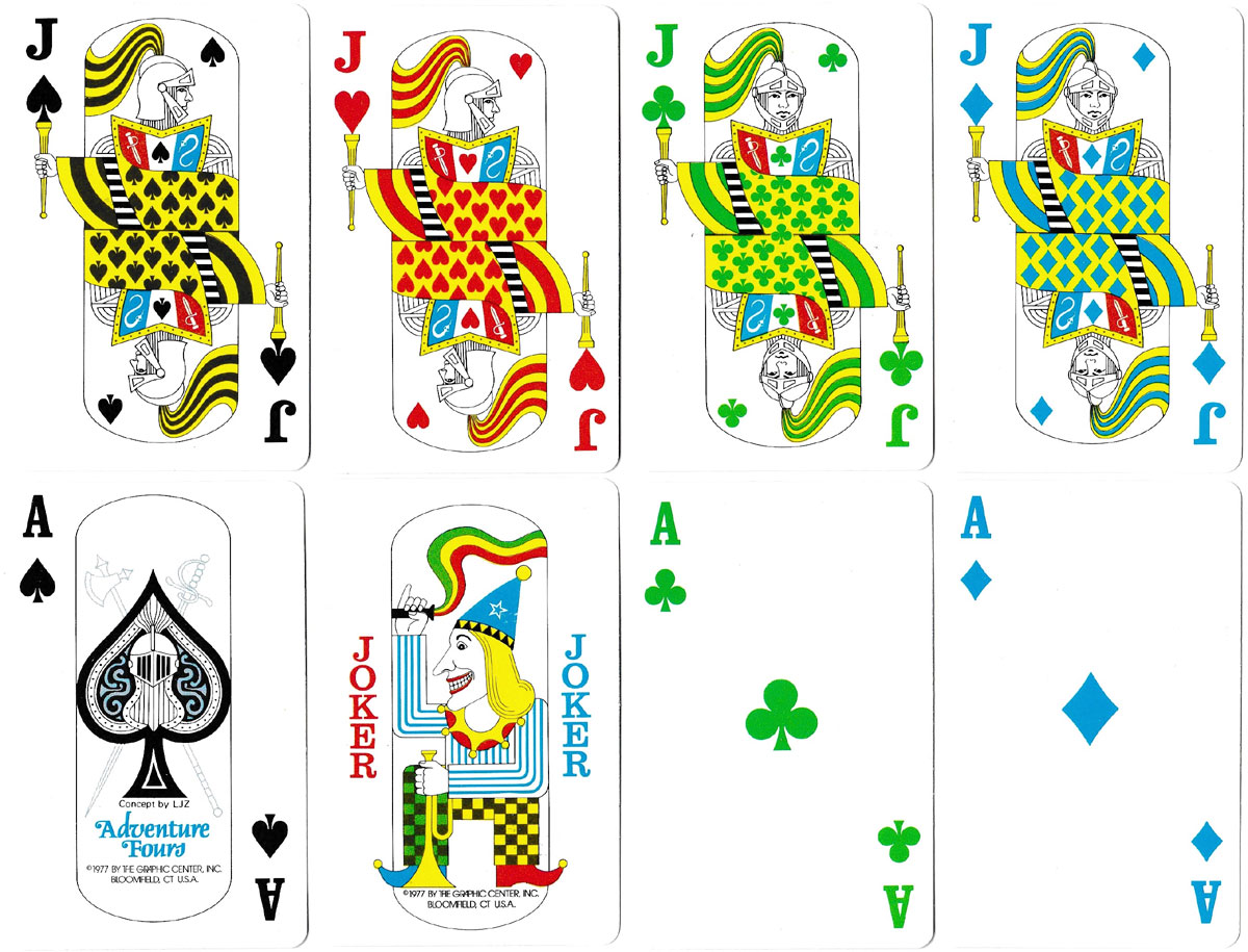 Above: Adventure Fours playing cards produced by the Graphics Center Inc., Bloomfield, CT in 1977.