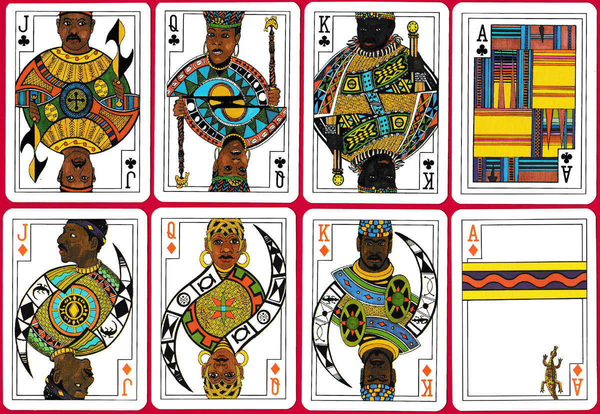 African art and symbolism on playing cards designed by John J. Beckvermit III, USA, 1994.