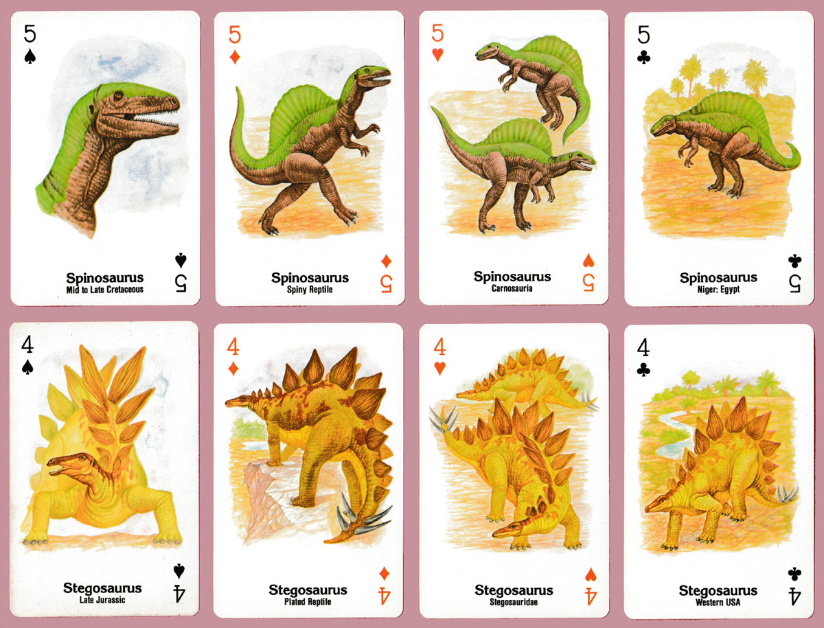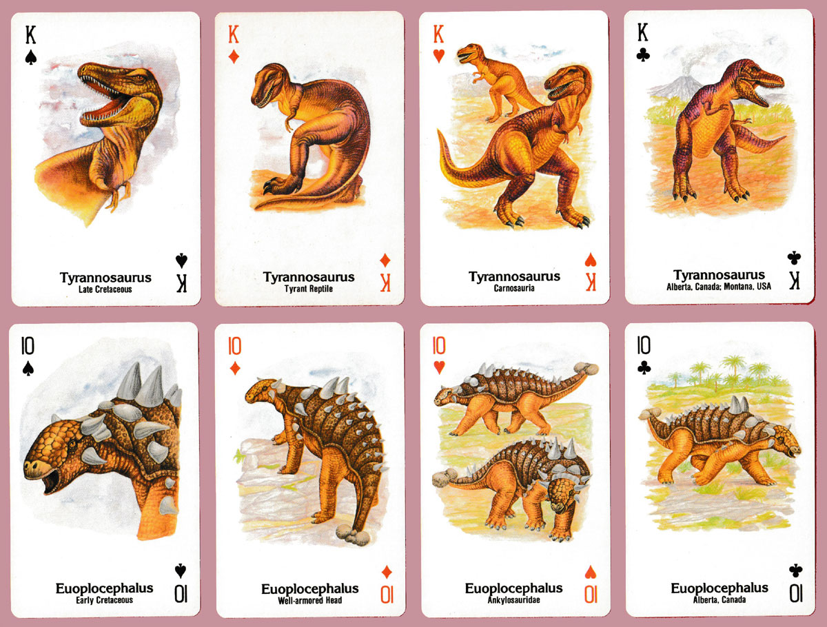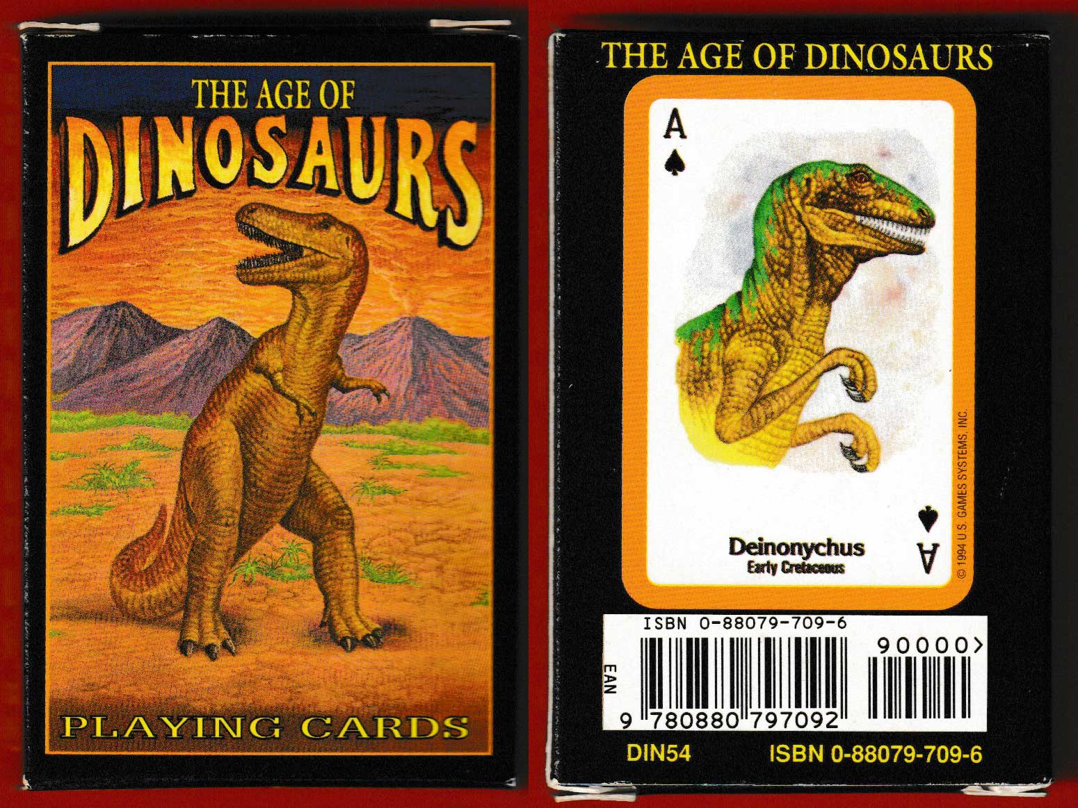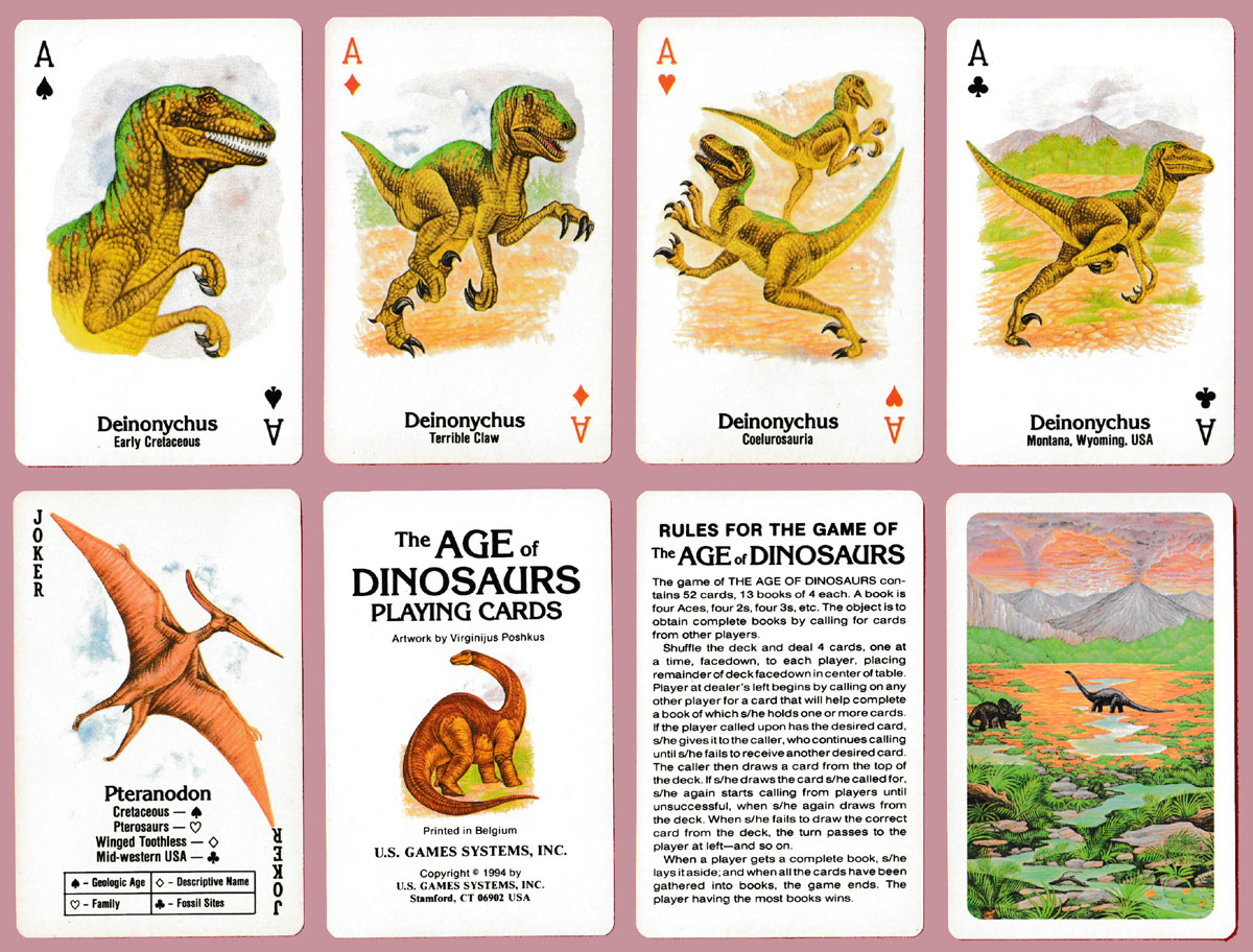 Above: The Age of Dinosaurs playing cards with artwork by Virginijus Poshkus. Made by Carta Mundi, Turnhout, Belgium, for U.S. Games Systems, Inc., Stamford, CT, USA, 1994. 52 cards + 1 Joker + 1 title card + 1 rules card in tuck box. Size: 57 x 88.5 mm. Copyright © 1994 by U.S. Games Systems, Inc.