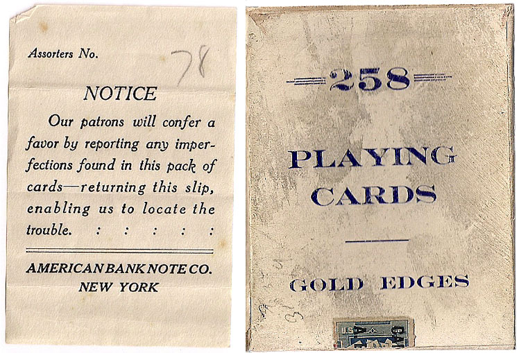 Above: American Bank Note Co. No.502 playing cards with fine pictorial back designs. The tiny lettering on the back of the lower card reads "Copyright 1910 American Bank Note Company". The No.258 box and quality control slip in fact appeared with the above No.502 decks with the same display card, which confirms that numbers on boxes and Aces of Spades were often mixed up. The American Bank Note Company used the same Ace of Spades in all their decks, sometimes numbered and named, or sometimes plain. The Joker was likewise used in most of their decks. (Click images to zoom)