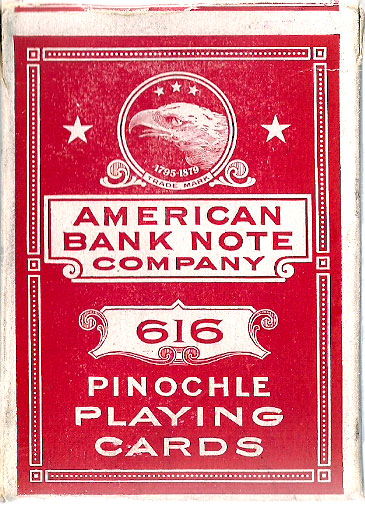 Above: American Bank Note Co. Pinochle 616 playing cards with 'banknote' or 'stock certificate' back design. Although it had been out of print for many years, USPCC reprinted a similar 'banknote' back in 2011 on their "Aristocrat" brand.