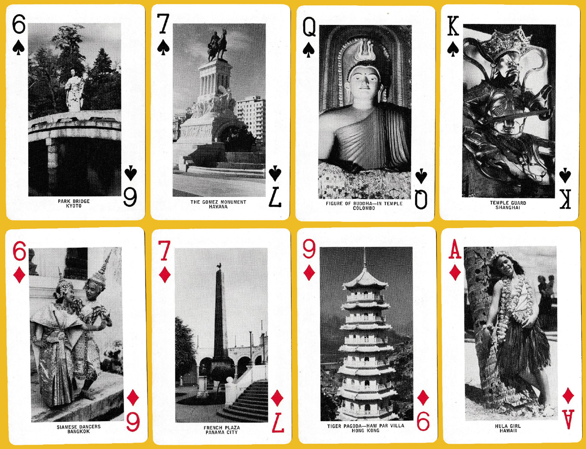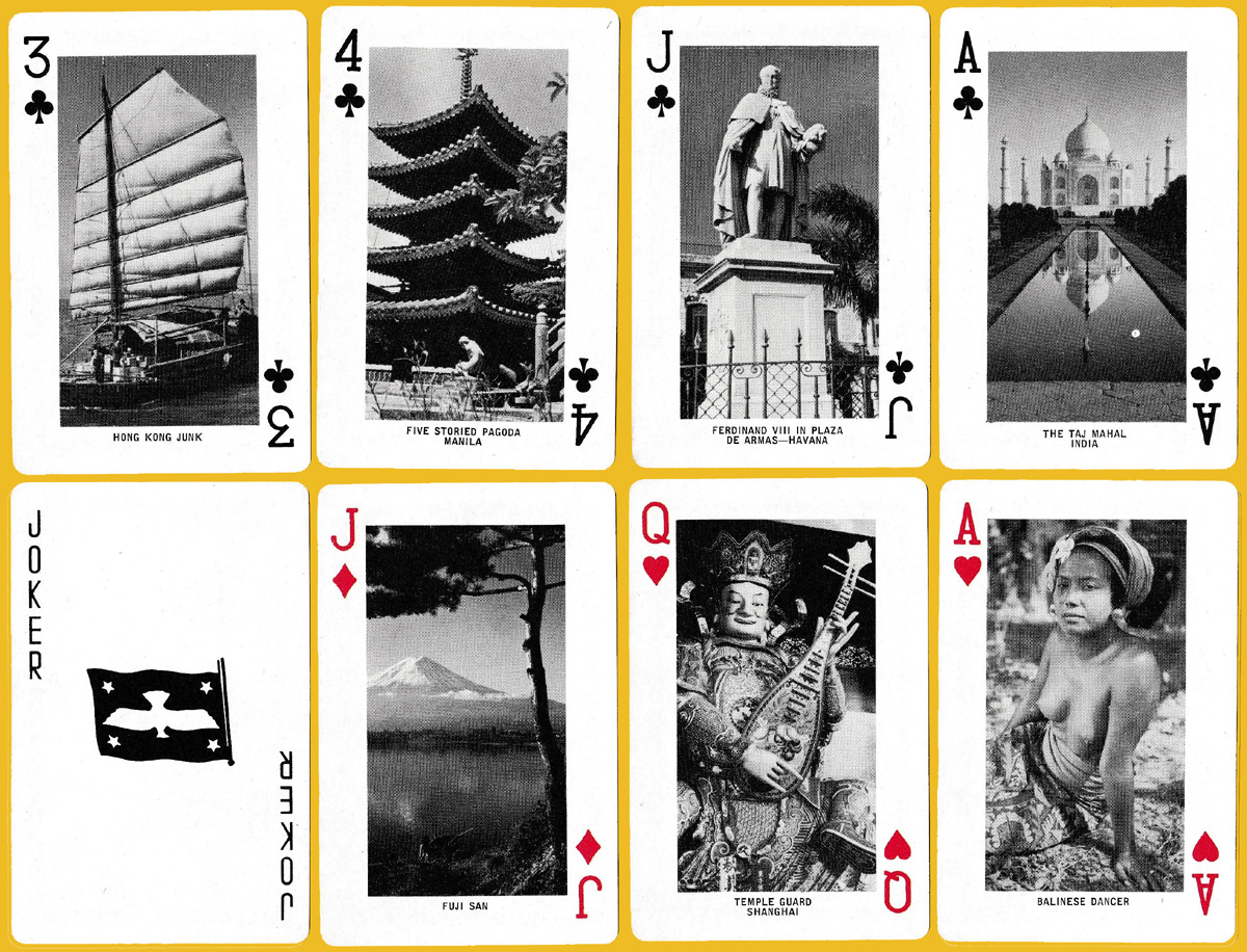 The cards show 52 black-and-white rectangular photos of places and monuments (presumably included in the APL cruises) in Hawaii, Cuba, Hong Kong, Panama, Bangkok, Egypt, Singapore, Japan and San Francisco. The jokers present the APL house flag. See the box►