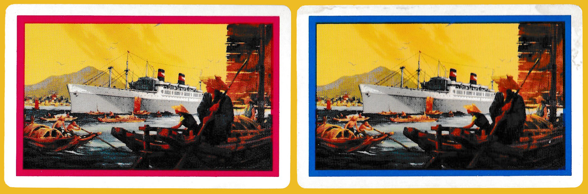 This pack (actually published as a boxed double set) was probably produced during the early to mid-1950s as the card back appears to show the SS President Wilson (with Chinese fishermen in the foreground). This ship operated on a Pacific Ocean route, traveling from San Francisco to Los Angeles, Hawaii, or the far east before returning back to San Francisco. The ship remained in service until 1960. With the allure of air travel and the growth of containerisation the company's passenger services steadily declined throughout the 1960s, and by 1973, the last APL liner, the SS President Wilson, completed her final round-the-world trip and was sold off.