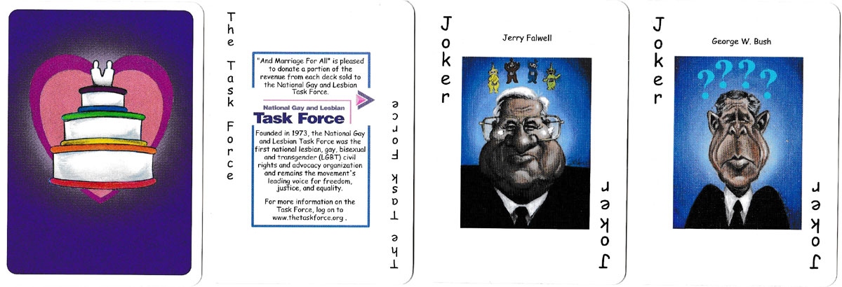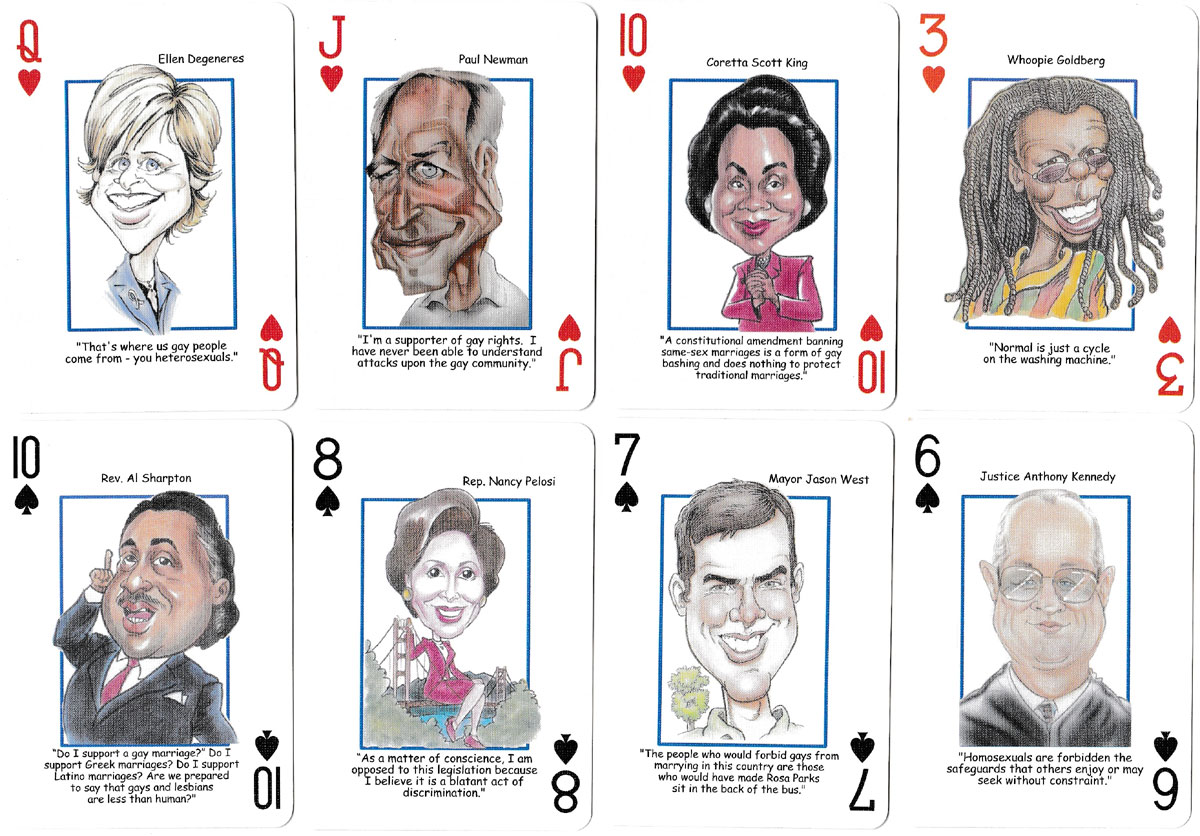 These cards were published in 2004 by the National Gay and Lesbian Taskforce as part of the debate regarding equal marriage rights for same-sex couples. The pack is colourful and humorous and includes images of key supporters, politicians, and celebrities as well as opponents of equal rights for all citizens. The playing cards show 52 caricatures accompanied by quotes by or about the individual depicted on the card. See the box►