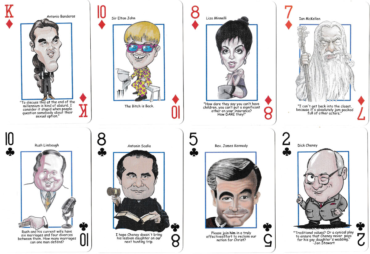 Several of those featured in the deck are still household names today: Michael Moore, Madonna, Whoopie Goldberg, Paul Newman, Arnold Schwarzenegger, Antonio Banderas, Elton John, Martina Navratilova, Liza Minnelli, Ian McKellen, Barbara Streisand, Tom Hanks, etc. The detractors, such as Rush Limbaugh and Rick Santorum, have not fared so well. The Jokers are Jerry Falwell and President George W. Bush.