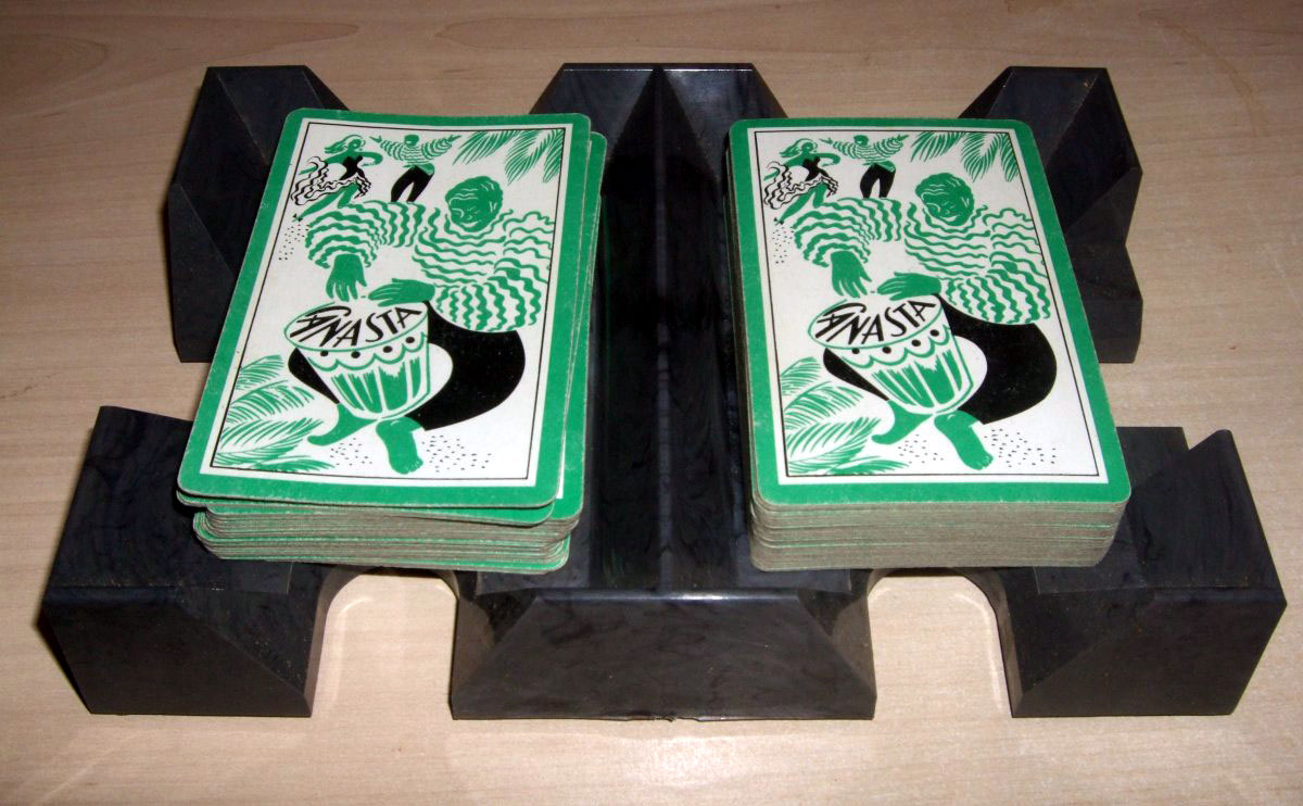Above: double set of ‘Duratone’ plastic coated playing cards in felt box, each deck contains 52 cards + 2 jokers, manufactured by ARRCO Playing Card Co, c.1950s.