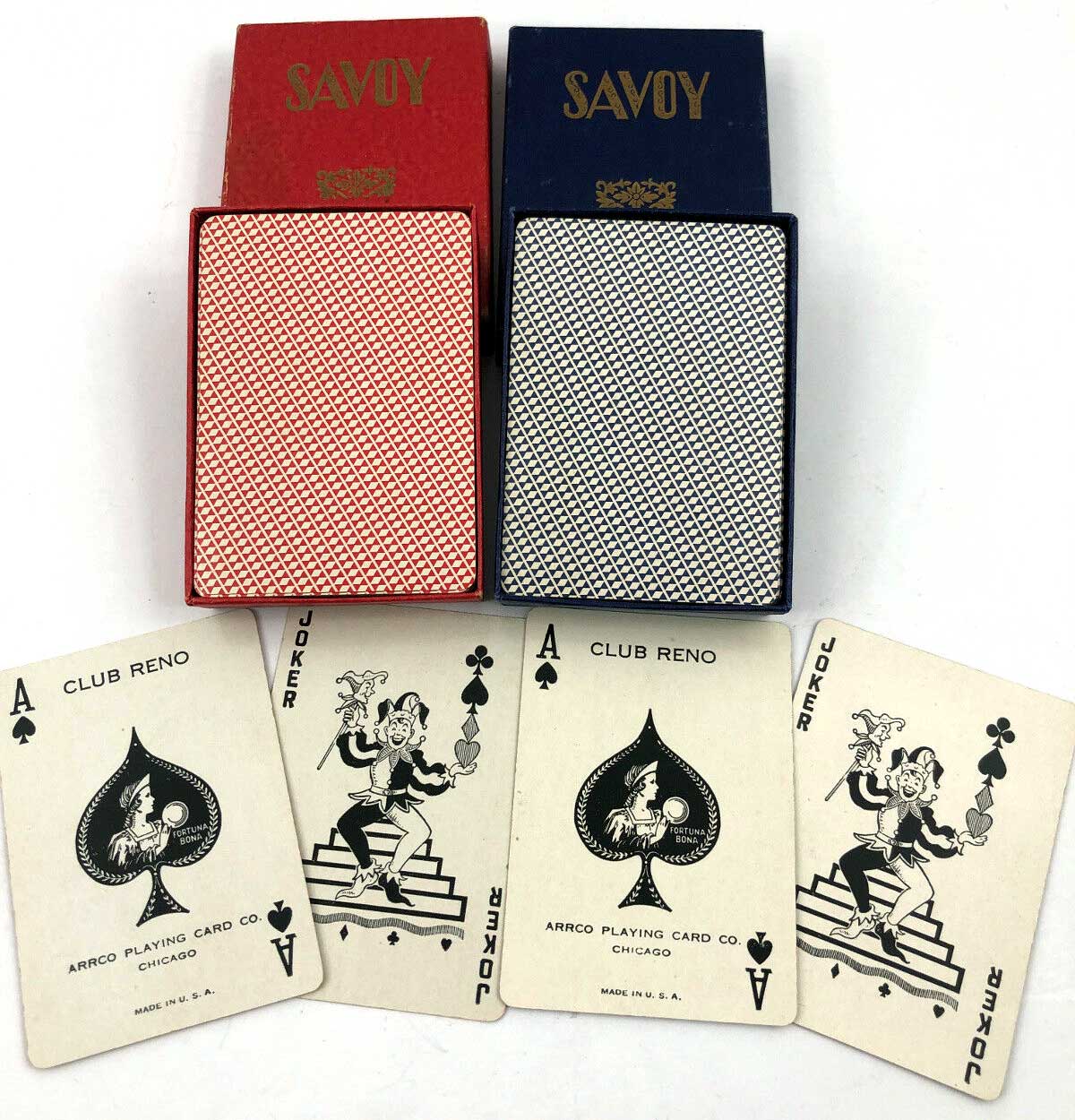 Above: Club Reno, one of many brands published by ARRCO, the ace of spades reads ‘Fortuna Bona’ (literally "Good Fortune", a benevolent aspect of the Roman Goddess of luck and chance), c.1940. Red or blue back, various boxes, various jokers. Image courtesy Matt Probert.