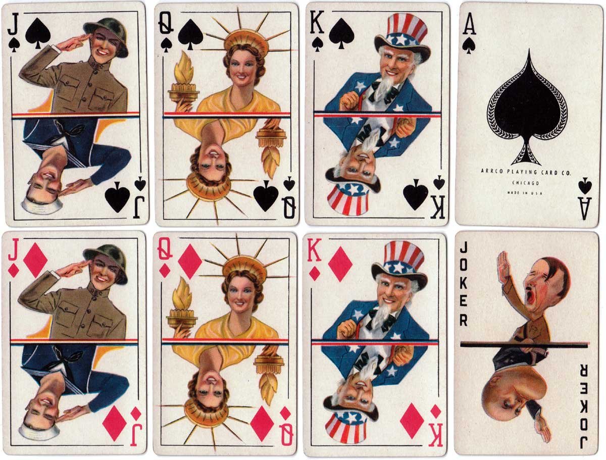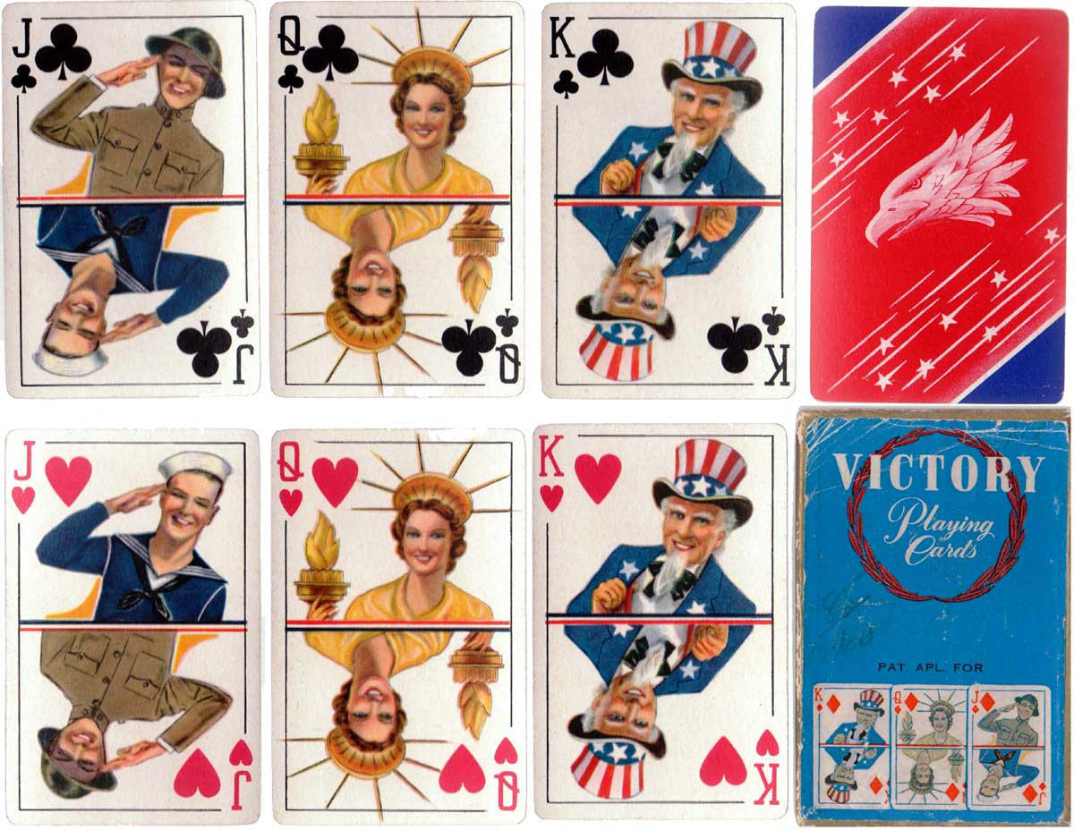“Victory" cards issued by ARRCO Playing Card Co soon after VE day celebrating the U.S. participation in the Allied victory, c.1945. The court cards are Uncle Sam, Lady Liberty repeated in each suit, with the jacks being different at each end, either a saluting soldier or sailor.