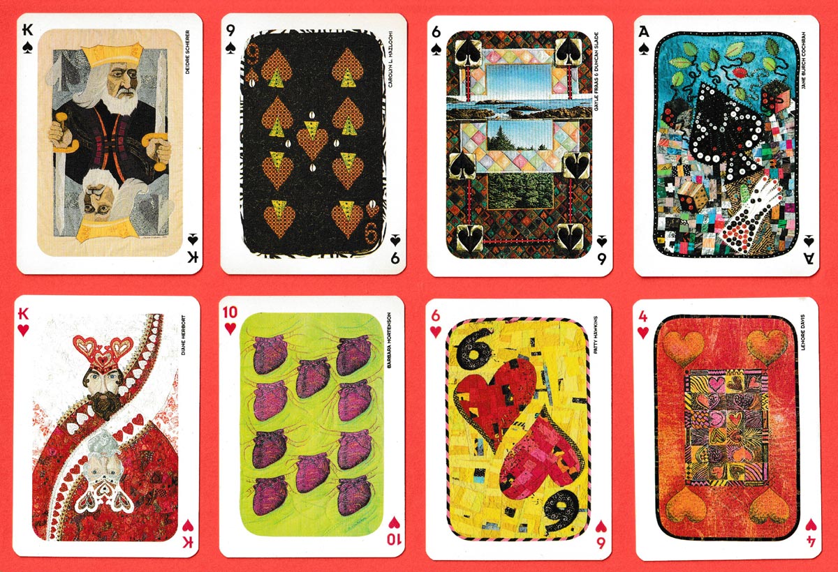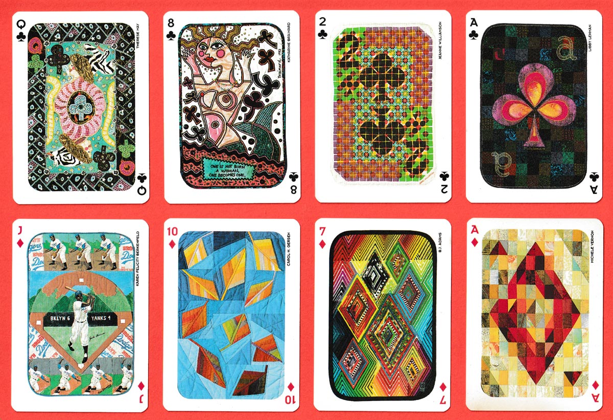This pack represents the culmination of a project organised by Sue Pierce, who asked 54 quilt artists to create a “stitched construction of three or more layers made primarily of fabric”, 28 inches high by 18 inches wide. Each artist was told which card they were to design. The 54 quilts then appeared at the Smithsonian Institution’s Renwick Gallery in the spring of 1995 before going on a three-year travelling exhibition. There is immense diversity in the designs, in terms both of technique and of style. Each artist’s name is given in the top right-hand corner. An extensive leaflet accompanies the pack describing each design. See the title card►