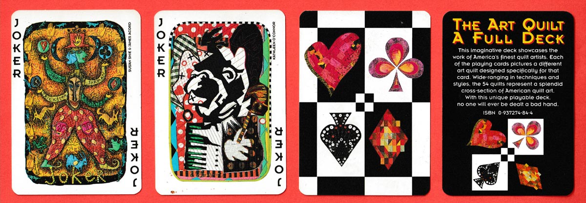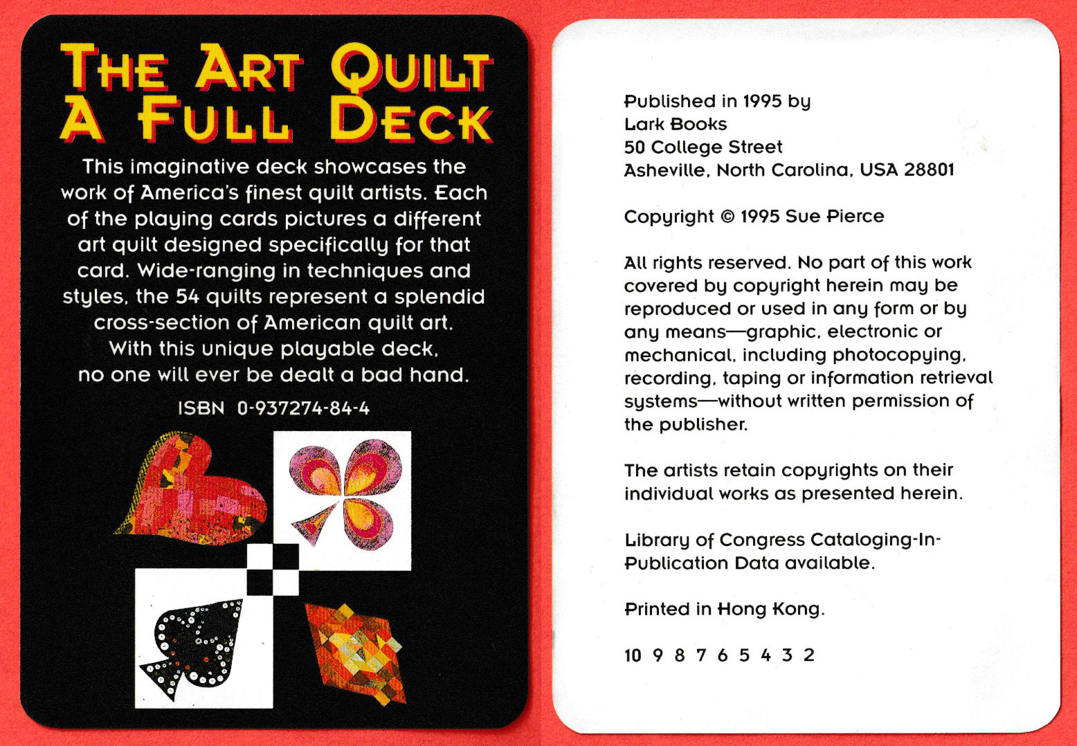 Above: Art Quilt playing cards published by Lark Books, Asheville, NC, USA, 1995. Printed in Hong Kong. 52 cards + 2 Jokers + title “card” + fold-out leaflet in clear plastic box. Size: 62 x 87.5 mm. © 1995 Sue Pierce.